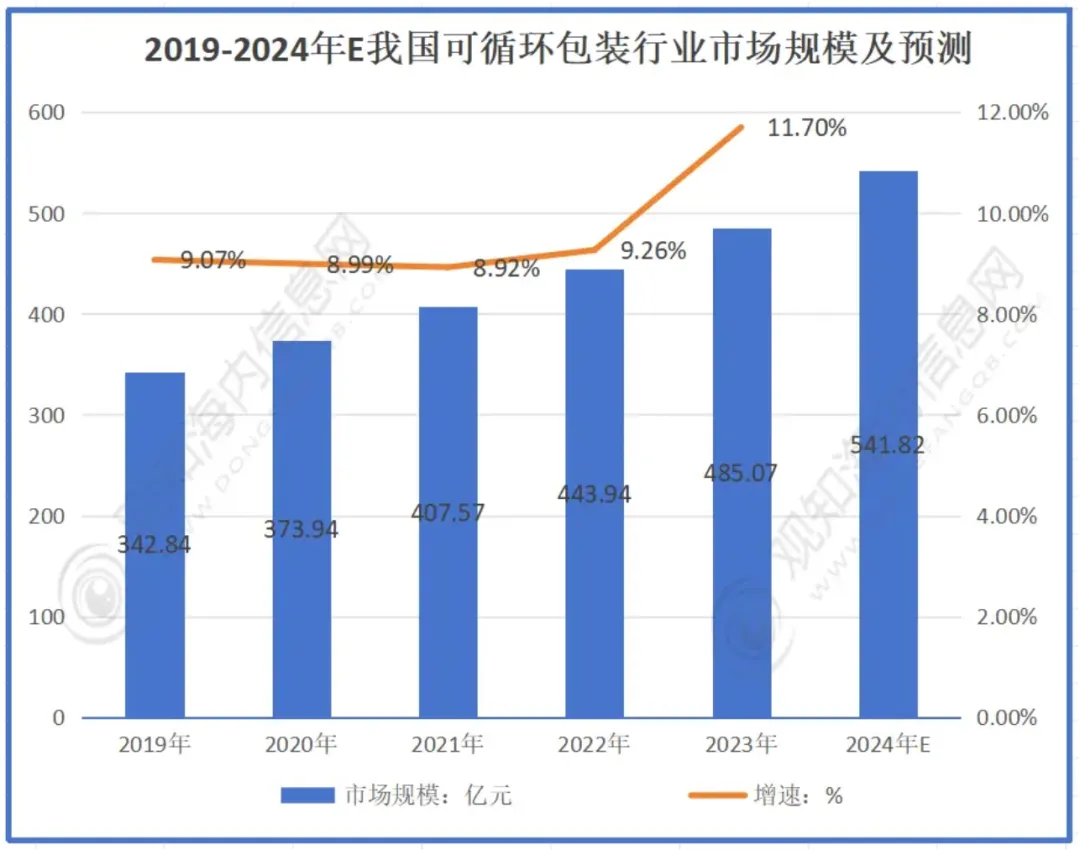 进一步聚焦到可循环包装领域。据观知海内信咨询数据,2024年中国循环包装市场规模达541亿元,同比增长12%。