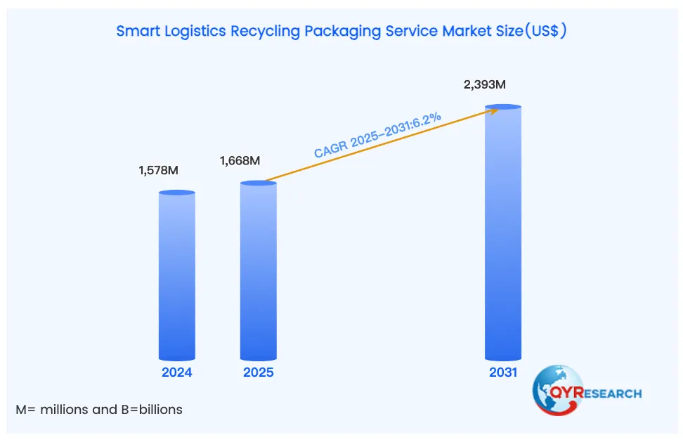 若聚焦到搭载IoT智能模块的物流循环包装这一更细分赛道,据QYResearch数据,2025年全球智慧物流循环包装服务市场规模约16.68亿美元,预计2031年增至23.93亿美元,年复合增长率6.2%。该口径仅统计运营服务相关收入,未包含智能循环包装箱体、智能模块等硬件的生产与销售规模,因此与本研究采用的全产业链统计口径存在差异。