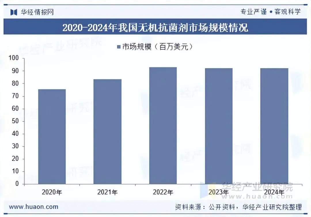 无机抗菌剂具有多种优势,使其在各个行业中受到广泛应用。首先,其高效的抗菌性能能够有效抑制细菌、真菌和病毒的生长,提供持久的保护。其次,无机抗菌剂通常具有良好的热稳定性和耐化学性,适用于各种苛刻环境。同时,无机抗菌剂的耐久性使得其在涂料、塑料和纺织品等多种应用中保持长期的效果,从而提升产品的使用寿命和品质。2024年我国无机抗菌剂市场规模达到了92.3百万美元,2020-2024年CAGR约为5.2%。