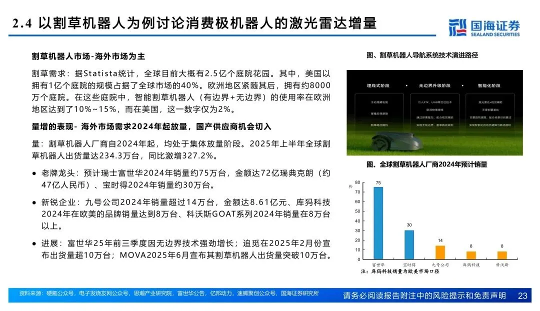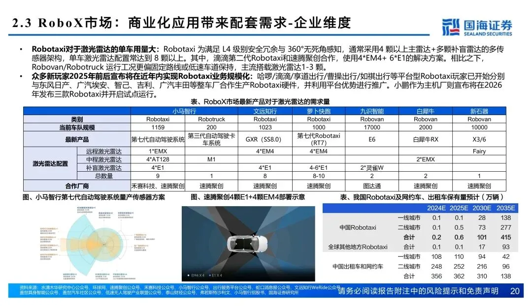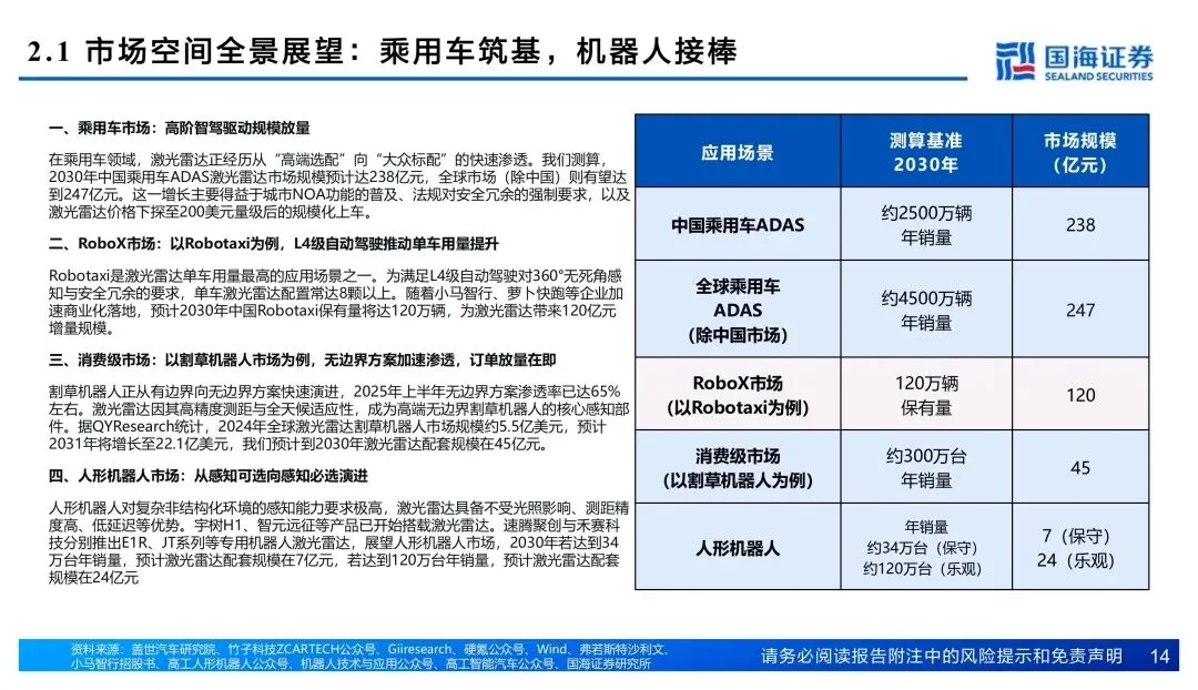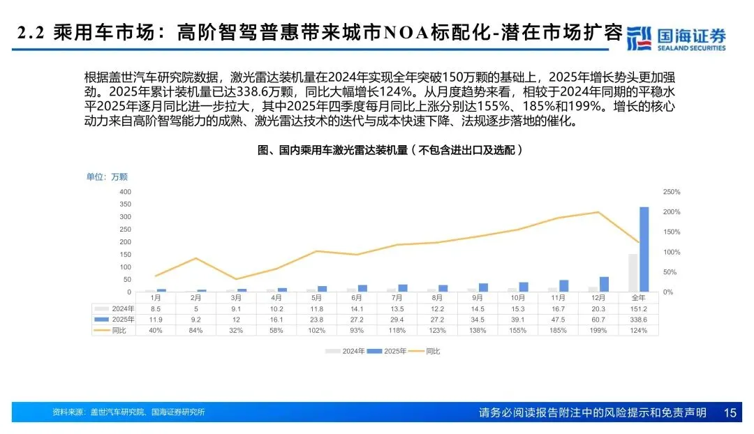 量这边刚起势。2025年国内乘用车装机338.6万颗,同比翻倍不止。智驾平权把激光雷达往15-25万车型里赶,单车搭载从1颗往2颗走。Robotaxi单车8颗起步,割草机器人、人形机器人也开始配雷达,增量场景打开了。