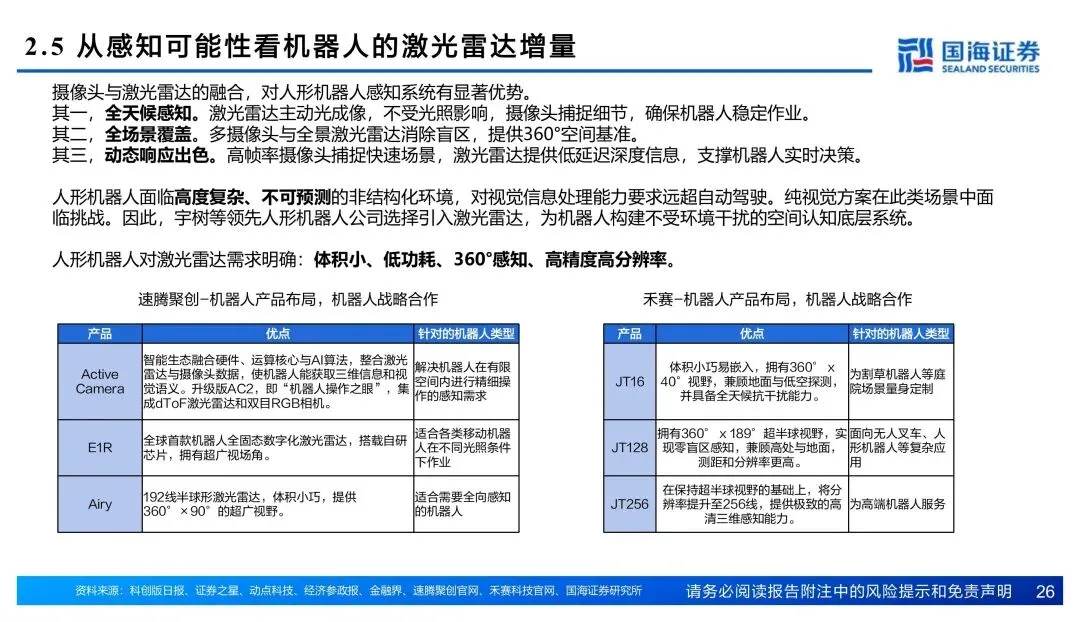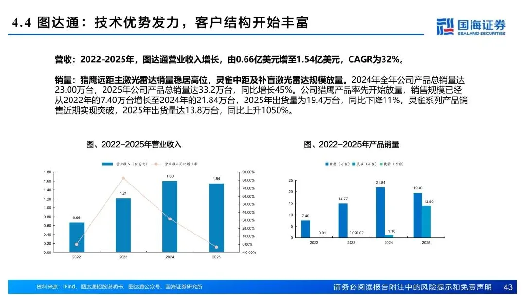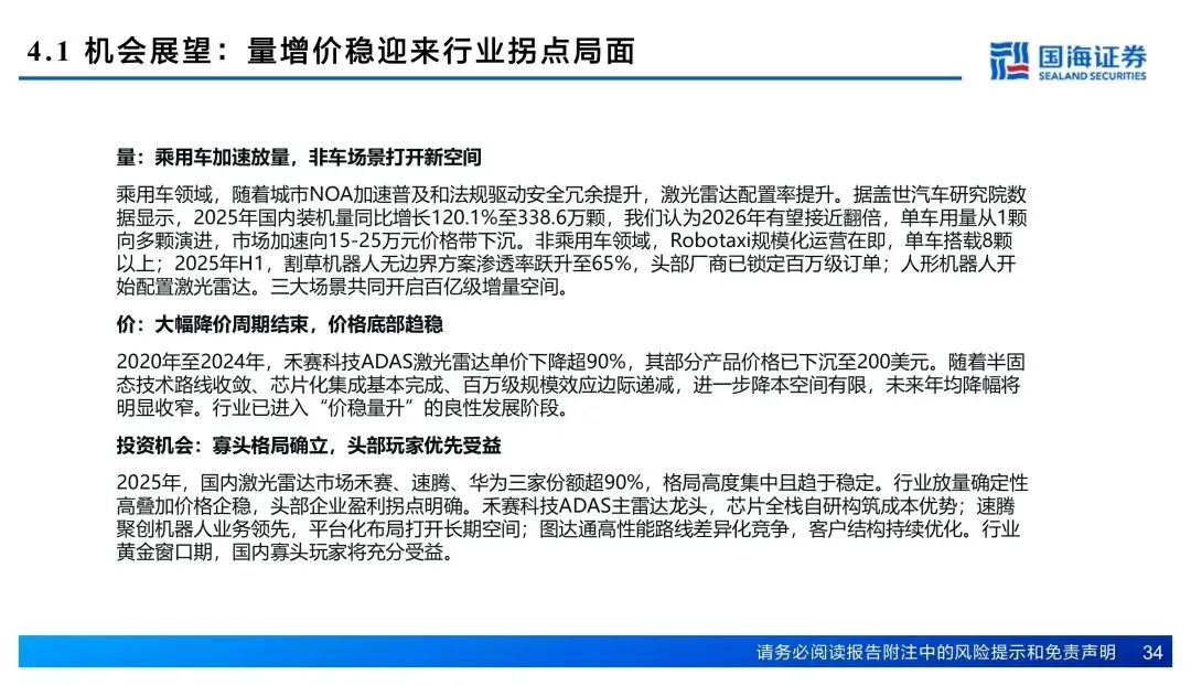 核心逻辑就四个字:量增价稳。乘用车放量叠加机器人场景扩容,存量寡头确定性吃红利。禾赛率先盈利,速腾机器人业务起量,图达通客户结构从蔚来往外拓。