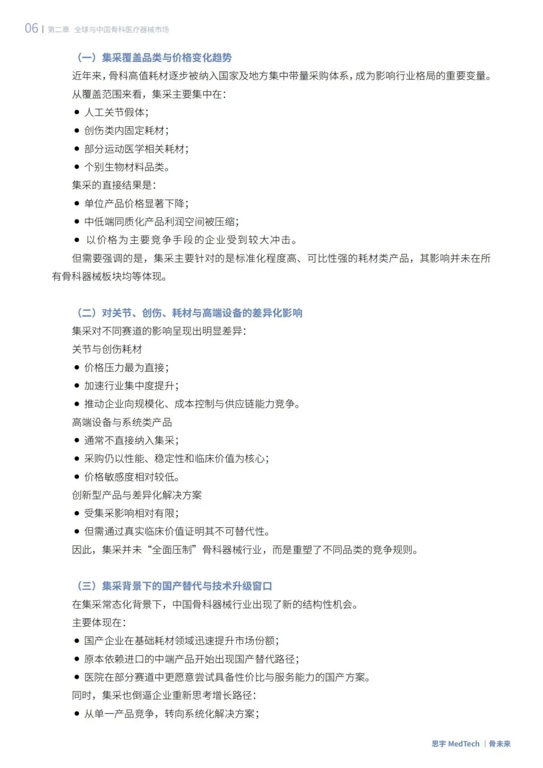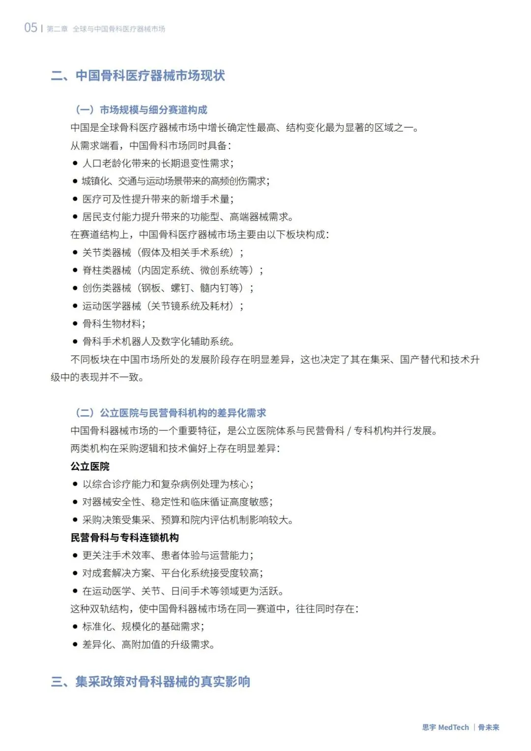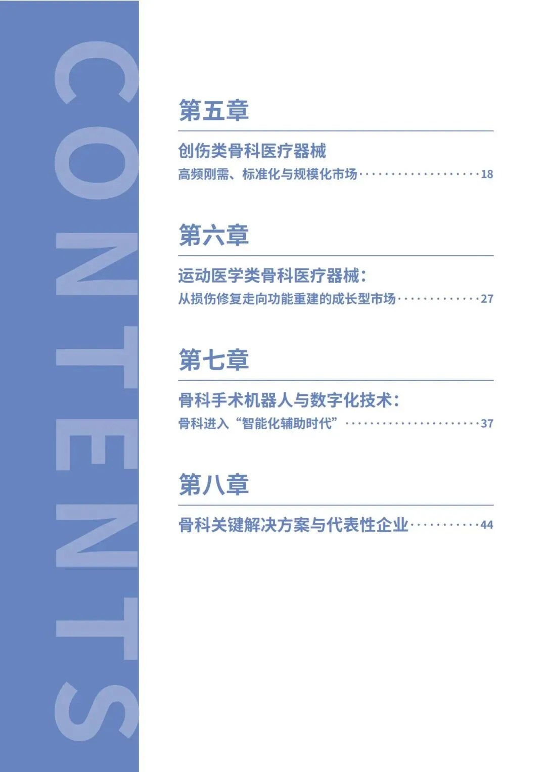 骨科需求发生结构性变革,从 “修复损伤” 转向 “长期功能管理”。老龄化带来多维功能退化问题,运动普及使中青年损伤增多,慢病管理理念融入骨科,推动临床路径从术中操作转向术前规划、术后康复全流程管理,器械价值从手术工具升级为临床路径能力节点,改变产业竞争逻辑。 集采常态化重塑骨科市场格局,全球与中国市场呈现差异化增长。成熟市场以产品更新换代与翻修需求为驱动,新兴市场依托基础医疗建设扩容;中国市场兼具老龄退行、创伤刚需、高端升级多重需求,公立医院与民营机构需求分化,集采推动行业从价格竞争转向规模化、系统化解决方案竞争,加速国产替代进程。 骨科核心品类向精准化、微创化、系统化升级。关节类器械从单一假体转向 “假体 + 数字化工具 + 康复” 全方案,假体材料与设计持续优化;脊柱类聚焦微创通道、精准内固定与复杂病例管理;创伤类依托标准化、模块化实现规模化供应,适配骨质疏松等特殊场景;运动医学凭借高消费属性快速增长,转向功能重建与全流程诊疗。 骨科手术机器人开启智能化辅助时代,成为核心创新增长点。机器人在关节置换与脊柱手术中成熟度最高,可提升定位精度、降低操作差异、缩短医生学习曲线;国内获批产品数量快速增长,覆盖关节、脊柱、创伤等场景,形成天智航、长木谷、罗森博特等本土企业与国际巨头同台竞争的格局,推动骨科手术标准化与精准化。 企业竞争转向综合解决方案与生态协同能力。国际巨头如史赛克依托全品类布局与机器人技术占据优势,中国企业通过基础产品规模化、中高端产品迭代、数字化工具协同实现突破,创伤领域国产替代率高,关节、脊柱、运动医学仍有技术提升空间,未来竞争核心是适配临床全路径的综合服务能力。