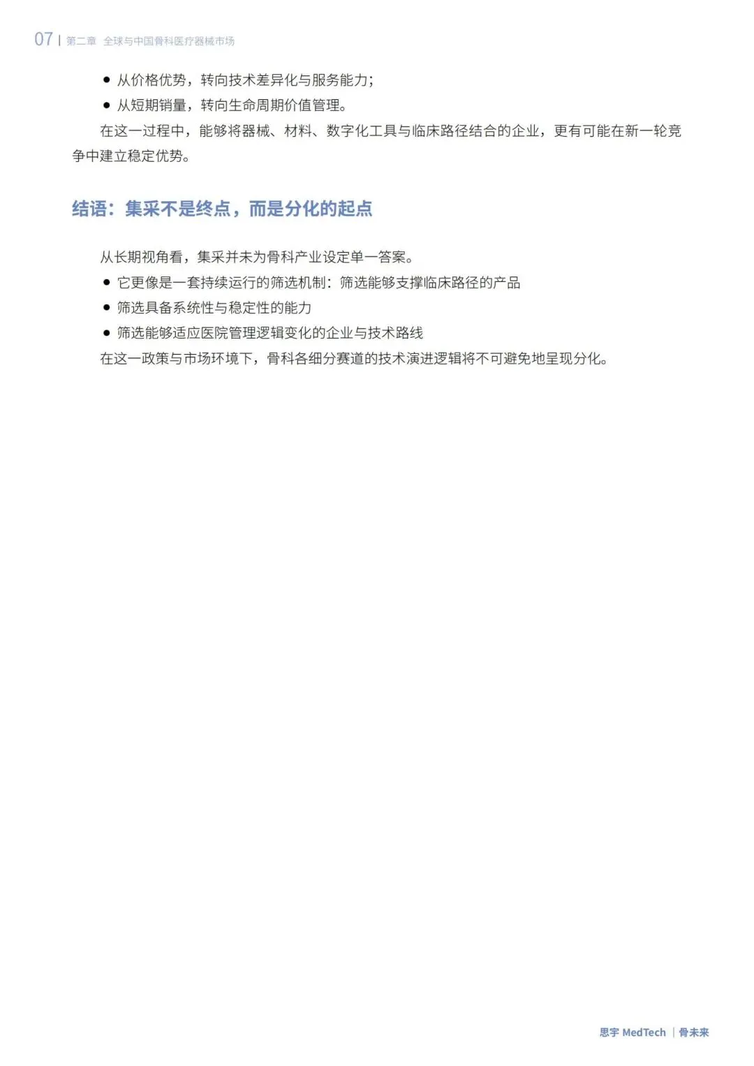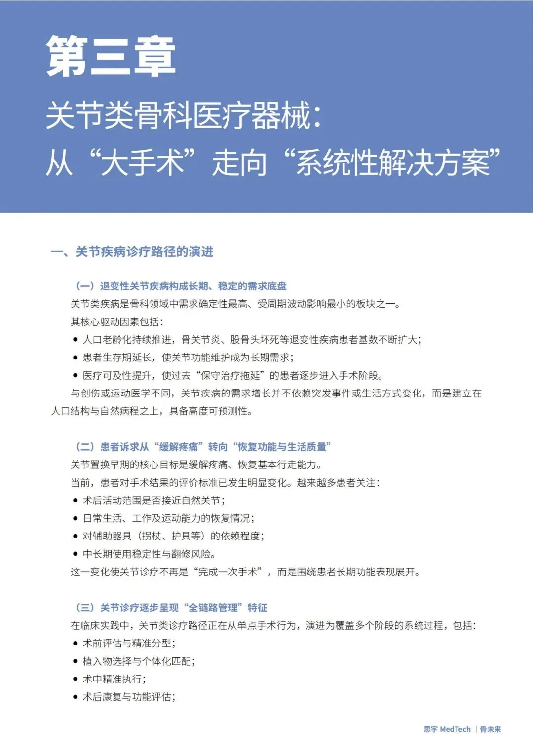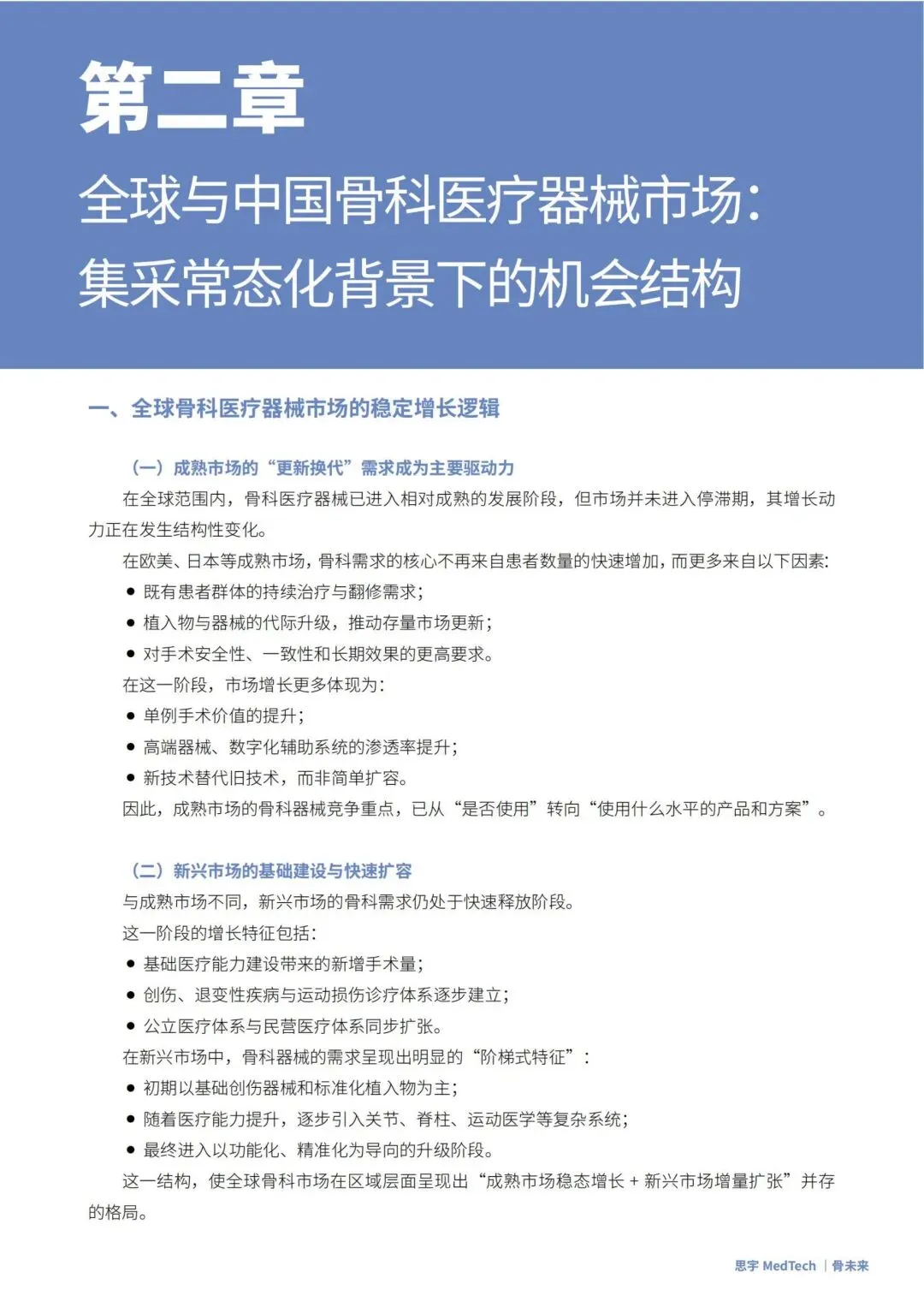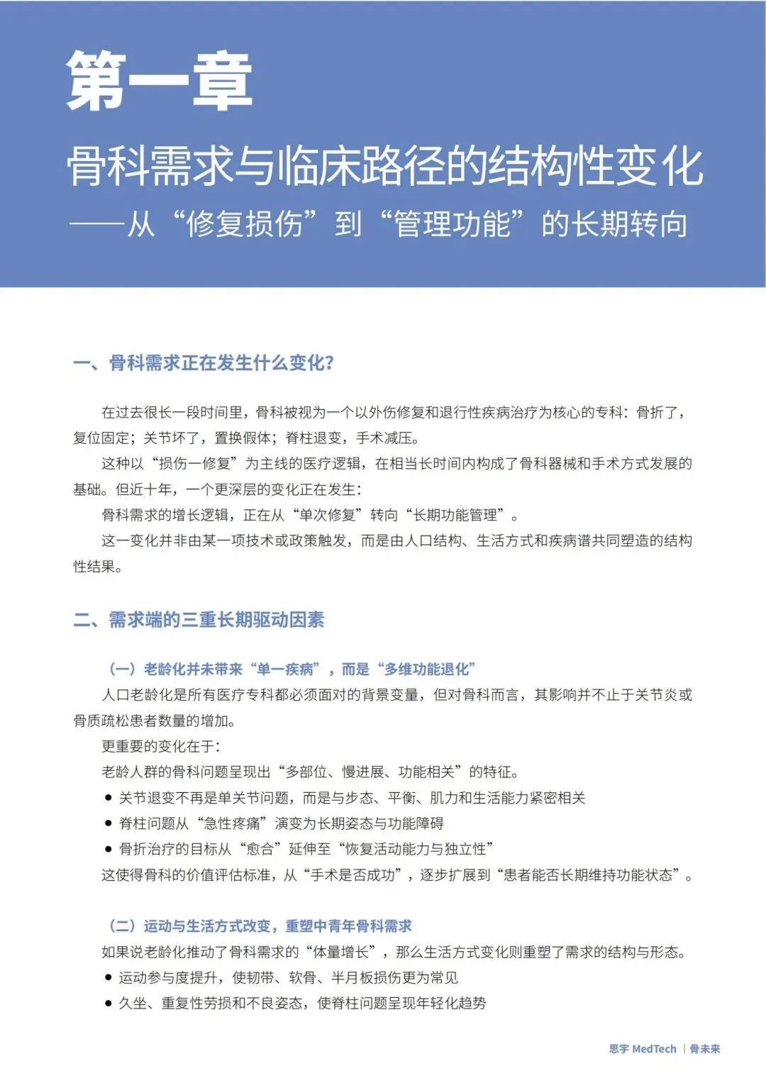 本白皮书由骨未来与思宇 MedTech 联合编制,全景解析全球及中国骨科器械产业格局。核心围绕骨科需求从单次修复向长期功能管理转变,分析集采政策下市场机会,拆解关节、脊柱、创伤、运动医学四大核心品类演进,聚焦生物材料与手术机器人创新赛道,呈现全球巨头与中国新锐企业发展路径,为行业提供全维度参考。