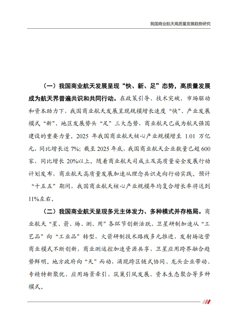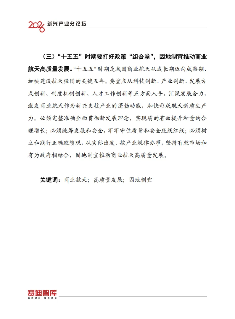 面对未来,“十五五”期间(2026-2030)是我国商业航天迈向成熟的关键五年。报告提出了五个维度的创新建议,这不仅是政府的施政纲领,也是企业布局的风向标: