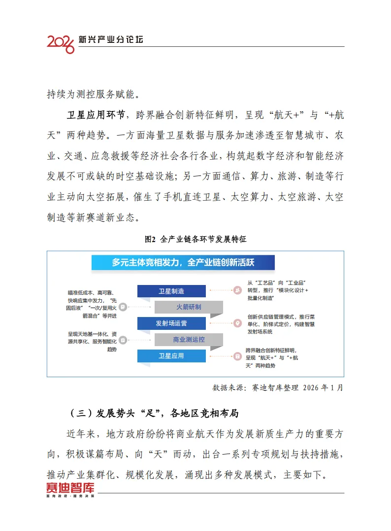 商业航天不仅是技术的比拼,更是区域经济格局的重塑。报告敏锐地捕捉到了各地政府“向天而动”的热情,并总结了六种因地制宜的发展模式,避免了低水平的重复建设: