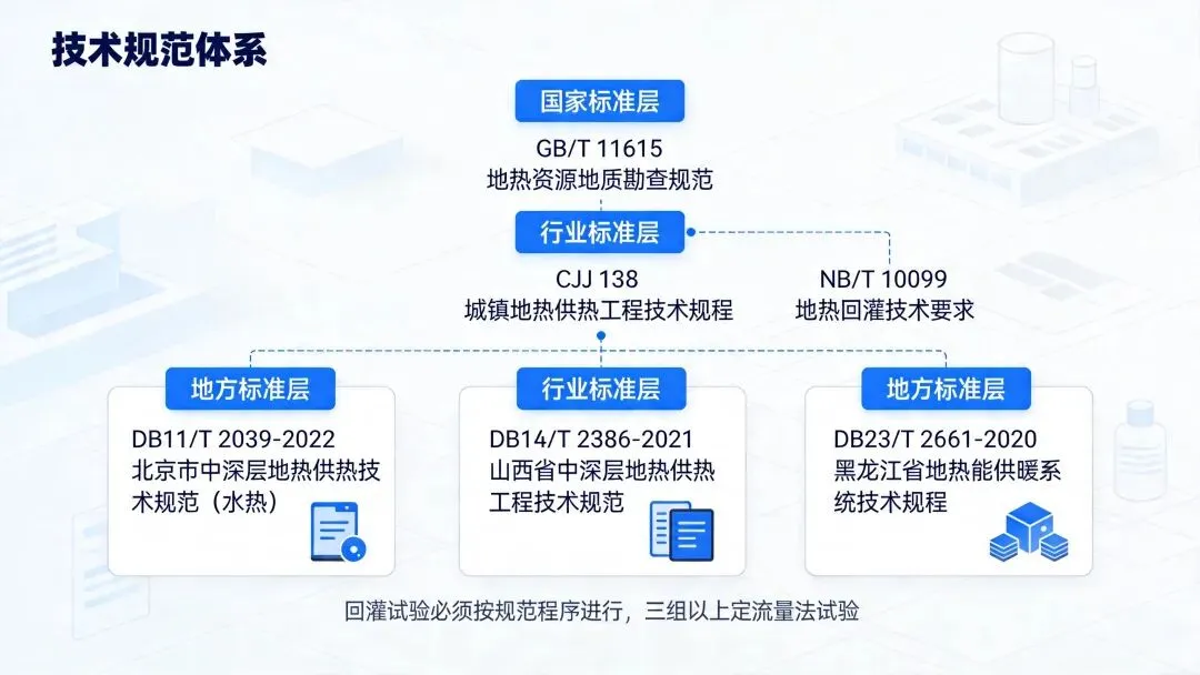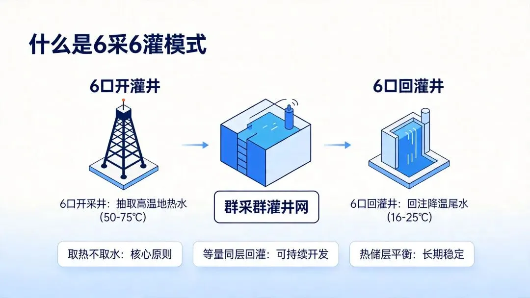 "群采群灌"是指在同一地热田中布置多口开采井和多口回灌井协同运行的井群开发模式,典型配置如6采6灌(6口开采井+6口回灌井)。 核心理念:只取热量,不消耗地下水,实现100%同层回灌,确保热储层动态平衡。