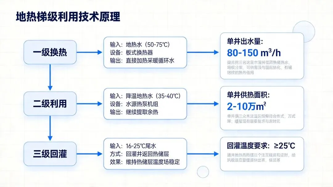 二级利用:降温后地热水(35-40℃)进入水源热泵继续提取余热