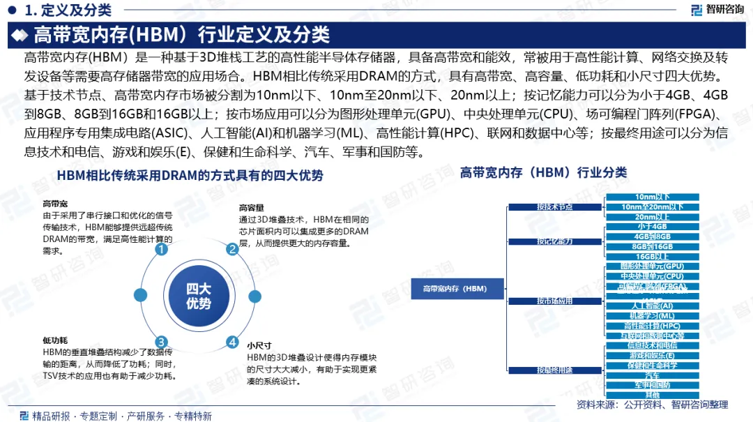 行业定义及优势:高带宽内存(HighBandwidthMemory,HBM)是一种基于3D堆栈工艺的高性能半导体存储器,具备高带宽和能效,常被用于高性能计算、网络交换及转发设备等需要高存储器带宽的应用场合。HBM相比传统采用DRAM的方式,具有高带宽、高容量、低功耗和小尺寸四大优势。