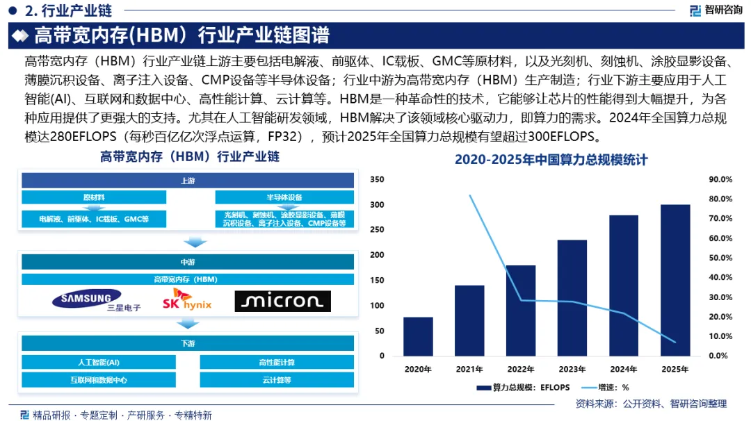 产业链核心节点:高带宽内存(HBM)行业产业链上游主要包括电解液、前驱体、IC载板、GMC等原材料,以及光刻机、刻蚀机、涂胶显影设备、薄膜沉积设备、离子注入设备、CMP设备等半导体设备;行业中游为高带宽内存(HBM)生产制造;行业下游主要应用于人工智能(AI)、互联网和数据中心、高性能计算、云计算等。