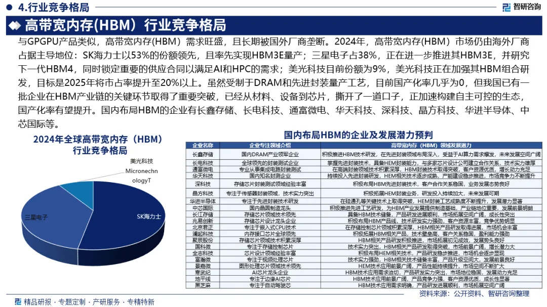 竞争情况:HBM需求旺盛,且长期被国外厂商垄断。2024年从市场格局看,海外厂商仍占据主导地位:SK海力士以53%的份额领先,且率先实现HBM3E量产;三星电子占比38%,正在进一步推进其HBM3E,并研究下一代HBM4,同时锁定重要的供应合同以满足AI和HPC的需求;美光科技目前份额为9%,美光科技正在加强其HBM组合研发,目标是2025年将市占率提升至20%以上。