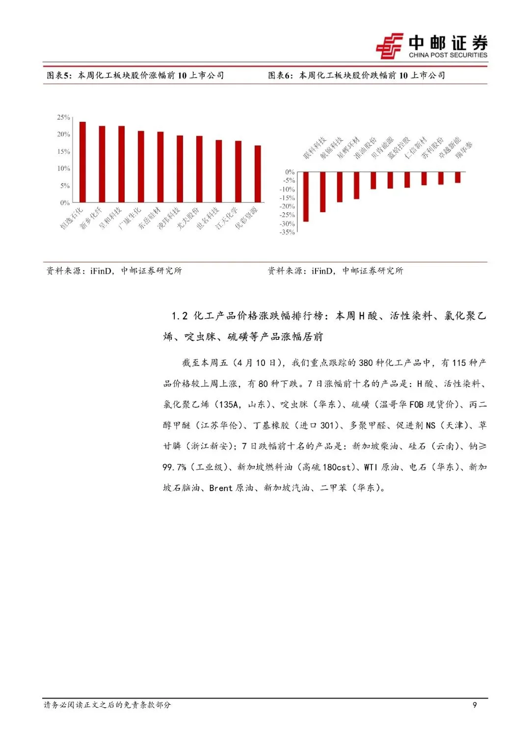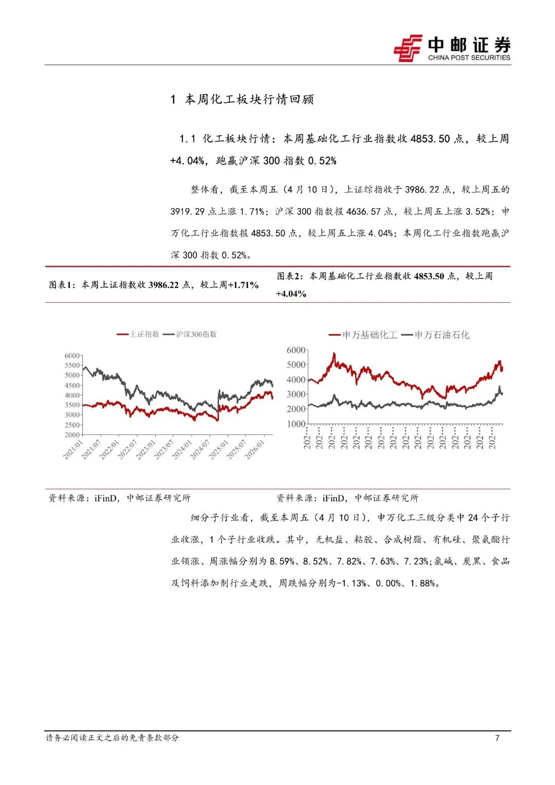 本周基础化工行业指数收4853.50点,较上周上涨4.04%,跑赢沪深300指数0.52%。细分子行业看,截至本周五(4月10日日),申万化工三级分类中24个子行业收涨,1个子行业收跌。其中,无机盐、粘胶、合成树脂、有机硅、聚氨酯行业领涨、周涨幅分别列为8.59%、8.52%、7.82%、7.63%、7.23%;氯碱、炭黑、食品及饲料添加剂行业走跌,周跌幅分别为-1.13%、0.00%、1.88%。