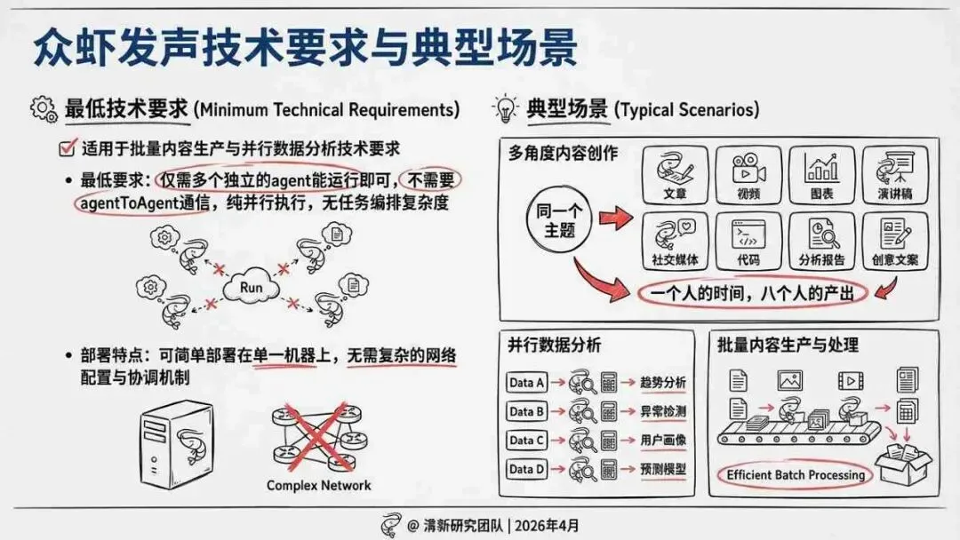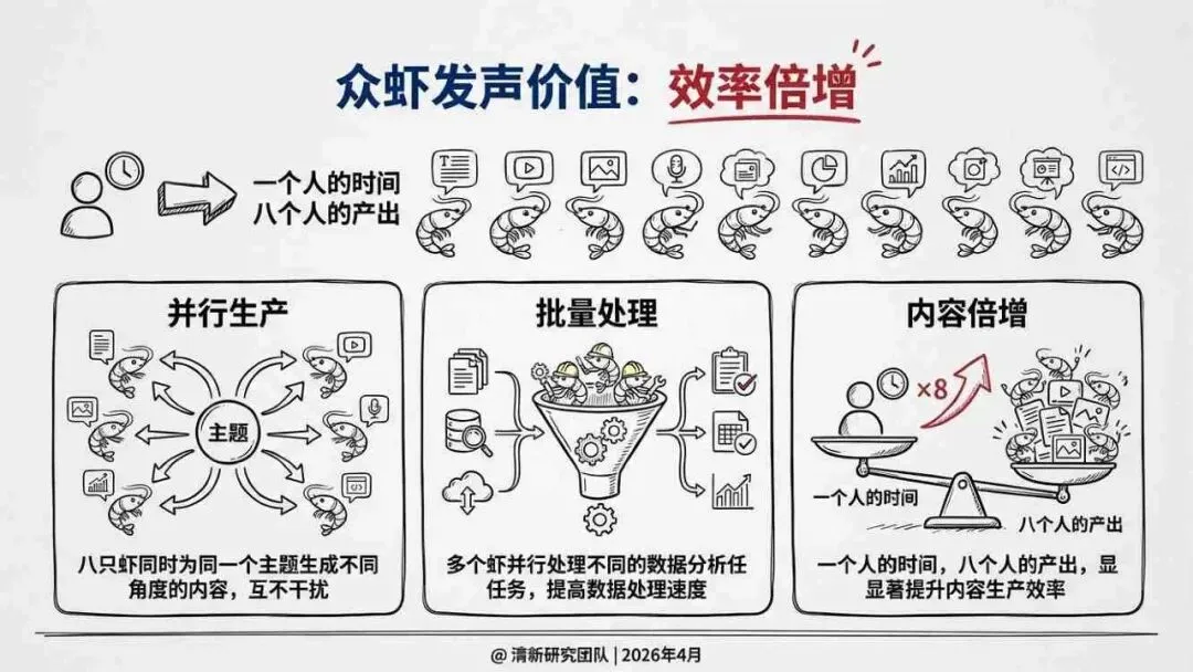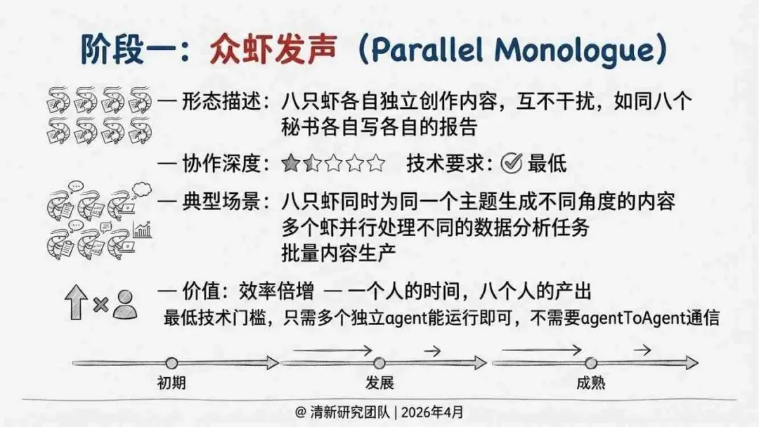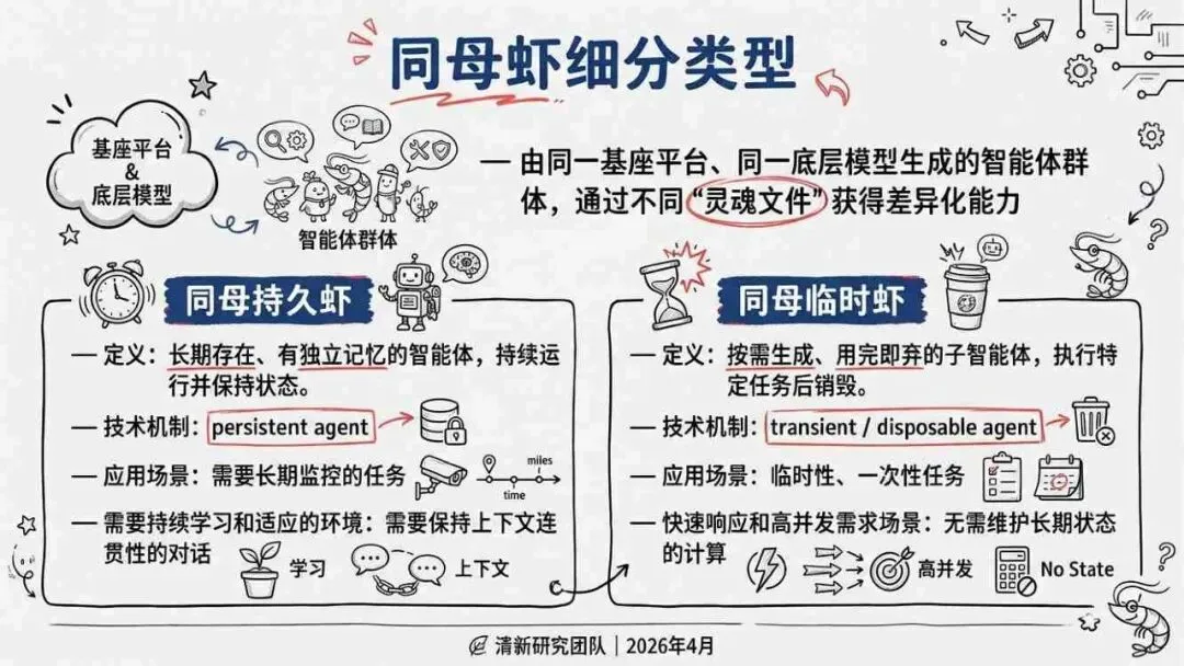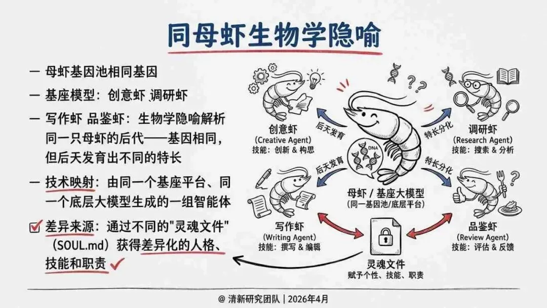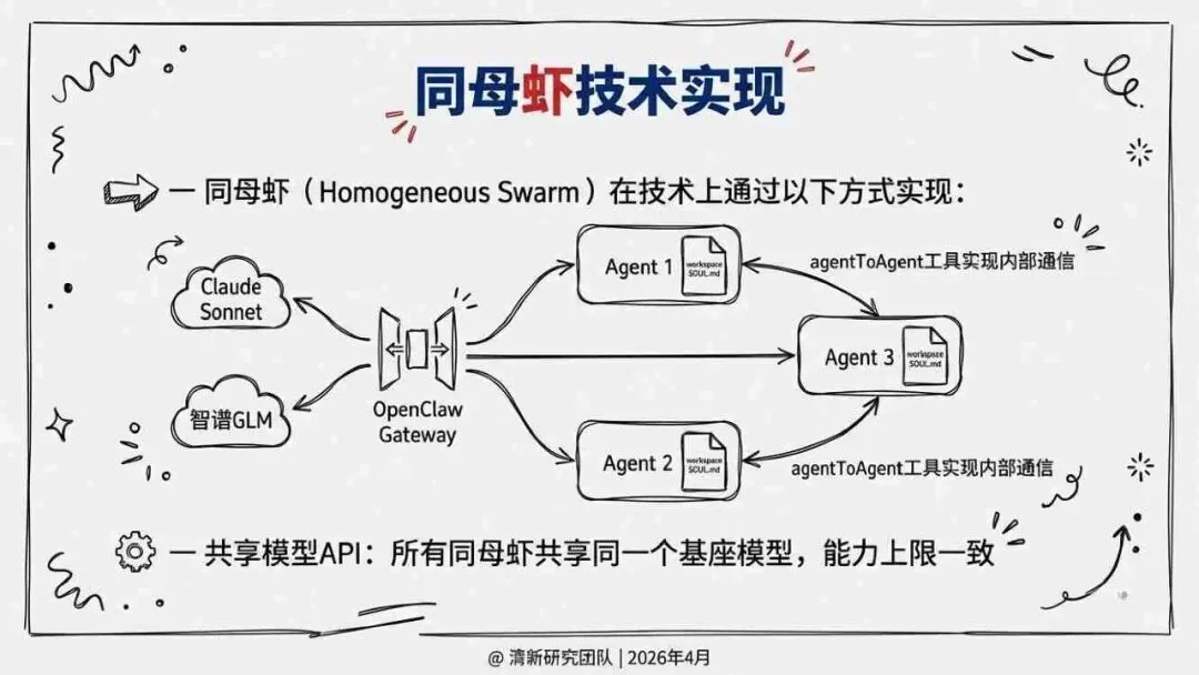 同一基座平台同一底层大模型生成的智能体,被称为同母虾。它们共享同一个模型 API,能力上限完全一致。技术上,一个 OpenClaw Gateway 进程就能运行多个同母虾,内部消息传递让通信延迟接近零。每只虾有独立的会话历史和记忆,互不干扰。部署成本极低,一台普通机器就能支撑整个群体运行。