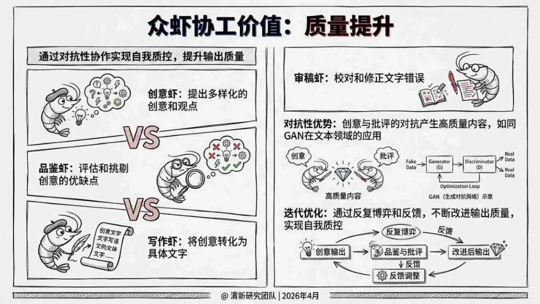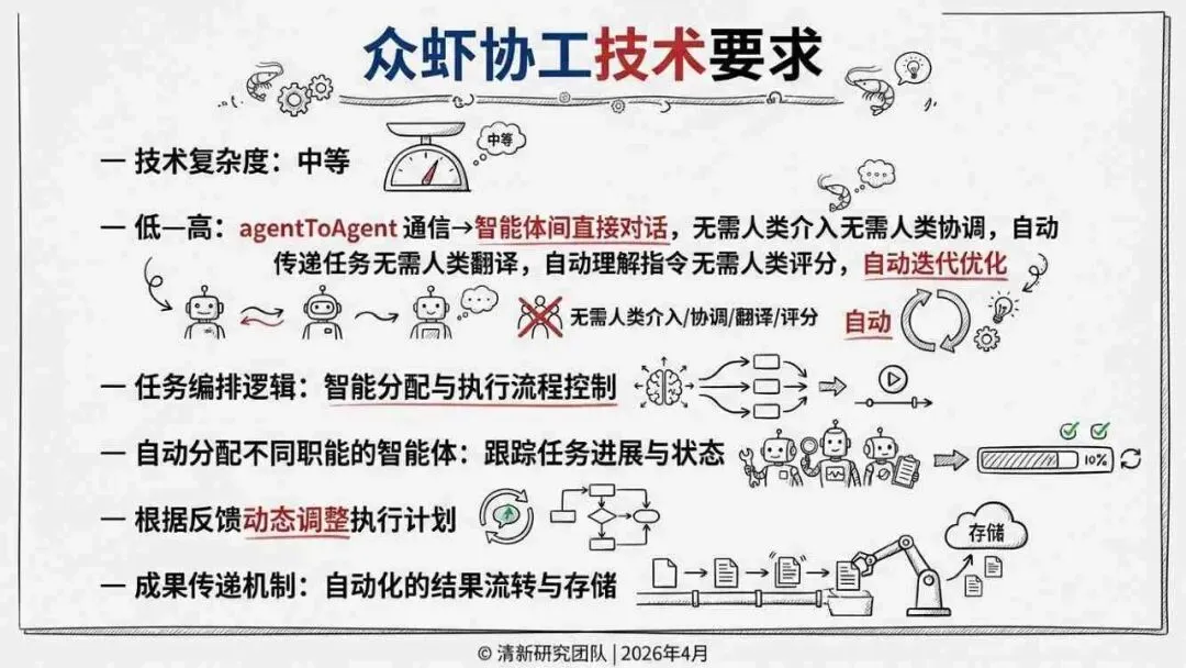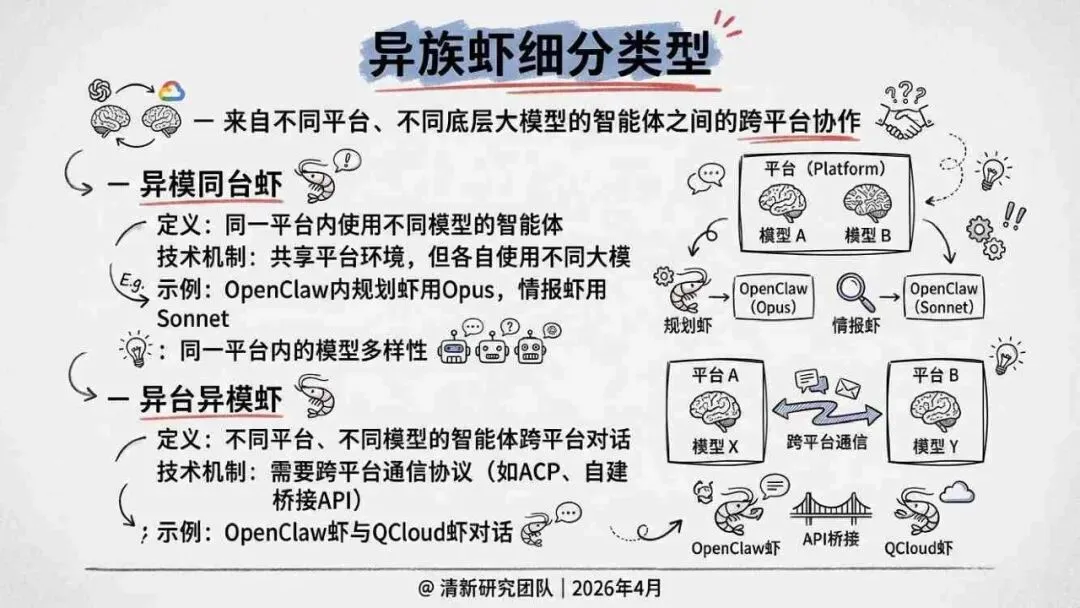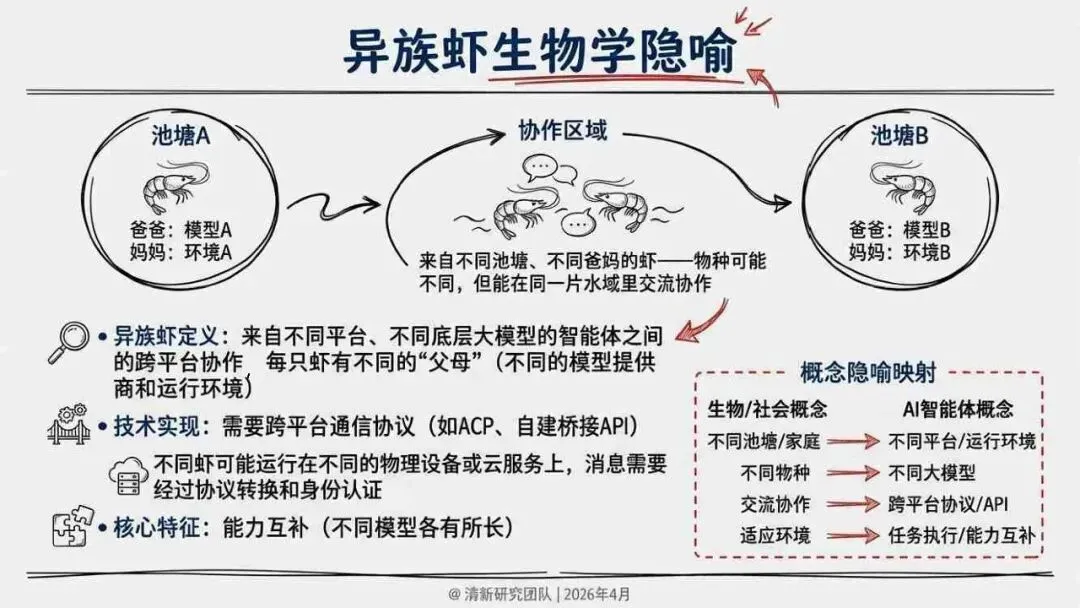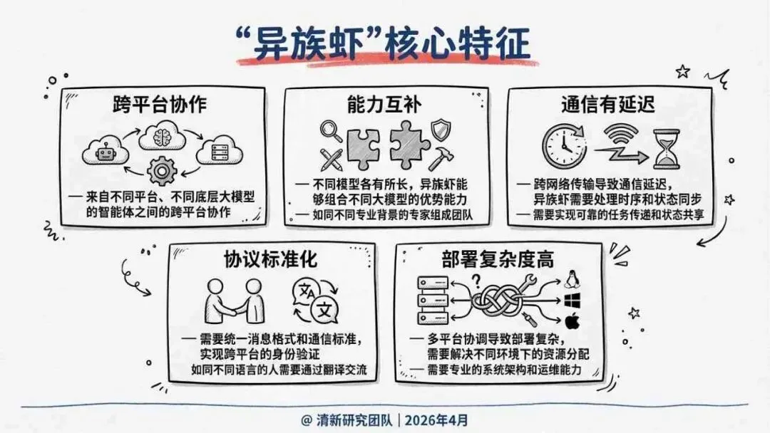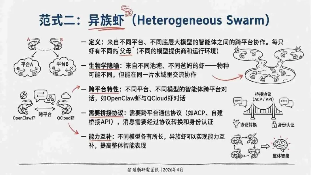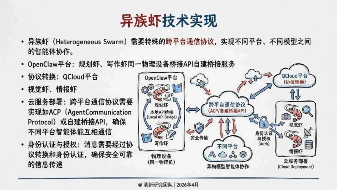 同母虾还能细分成持久虾和临时虾,前者长期存在保持状态,后者按需生成用完即弃,完美适配不同的任务需求。来自不同平台不同底层大模型的智能体,组成异族虾群体。它们就像来自不同池塘的虾,需要跨平台通信协议才能交流。ACP 协议和自建桥接 API 是实现这种协作的基础,消息要经过协议转换和身份认证才能传递。异族虾最大的优势是能力互补,不同模型的特长可以叠加,整体智能表现远超单一模型群体。不过跨网络传输会带来通信延迟,多平台协调也让部署复杂度大幅上升。