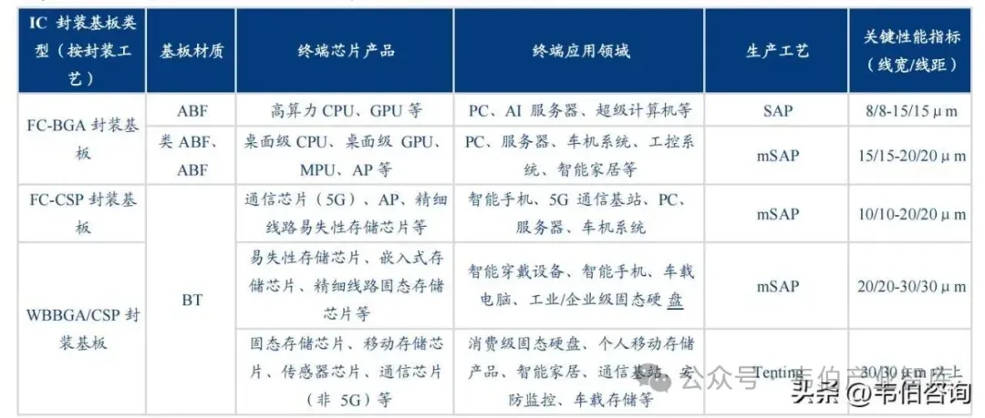 BT载板:具备较好的稳定性和性价比,主要运用于存储芯片及泛消费电子(如射频、传感器等)领域。