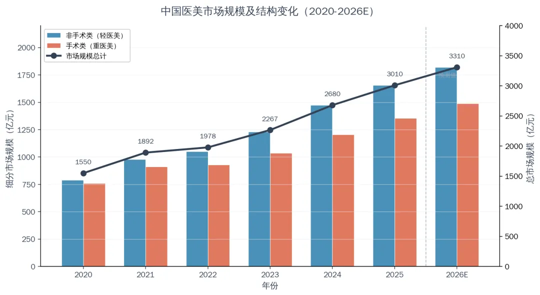 过去六年,中国医美市场保持了强劲的增长势头。根据德勤、毕马威、艾瑞咨询等多家机构数据综合测算,中国医美市场规模从 2020 年的约 1550 亿元增长至 2025 年的约 3010 亿元,复合年增长率约 14.2%。预计 2026 年市场规模将达到约 3310 亿元。其中,2022 年受疫情反复影响,增速明显放缓至 4.5%,2023 年强劲反弹至 14.6%,2024 年延续复苏趋势达 18.2%。