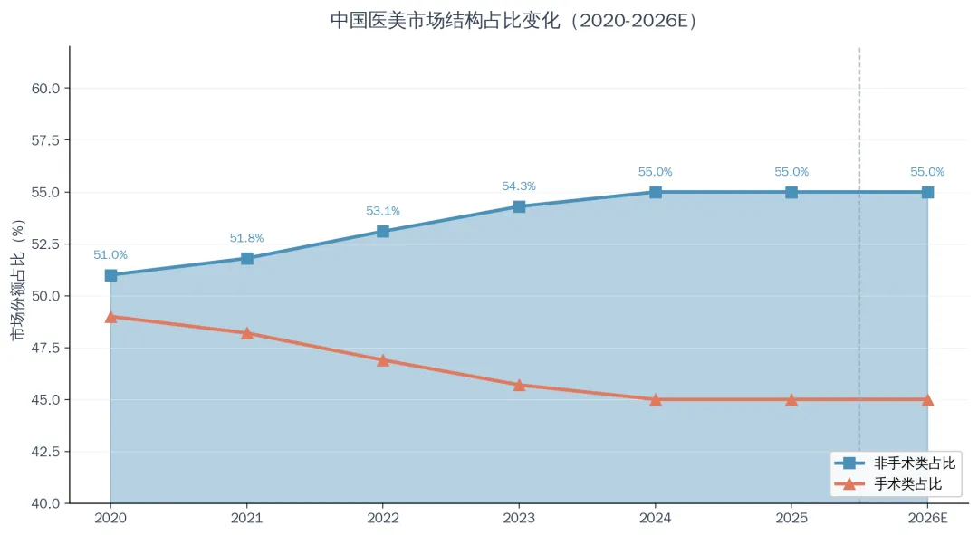 2020 年是中国医美市场结构的分水岭——非手术类市场规模占比首次突破 50%,实现对手术类的份额反超。截至 2024 年,轻医美市场占比已攀升至 55%,占据行业近五分之三的江山。预计 2026 年轻医美占比将稳定在 55% 左右。