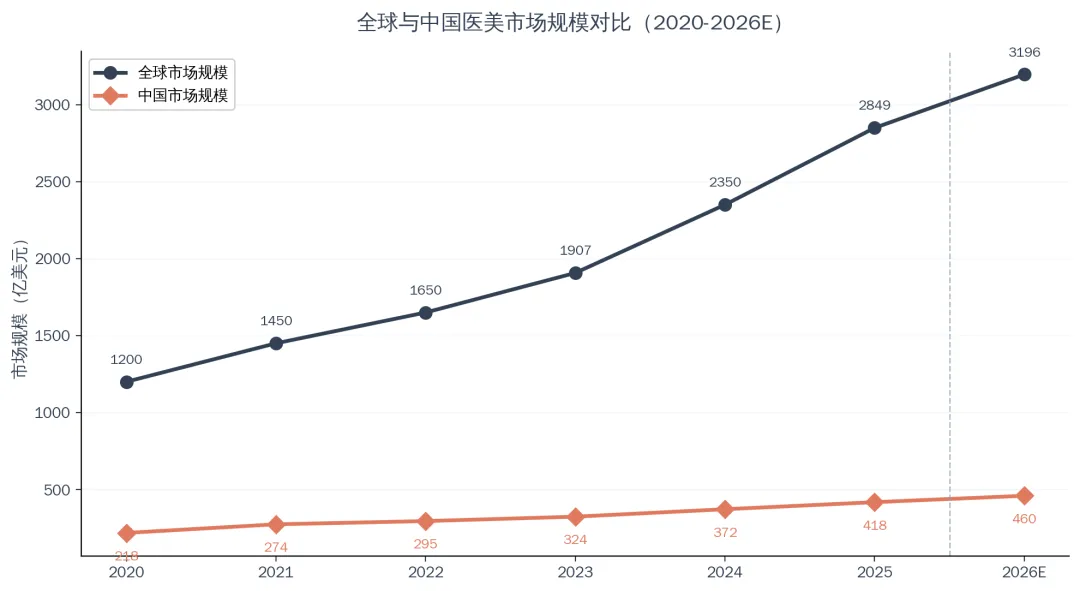 图 3:全球与中国医美市场规模对比(2020-2026E)