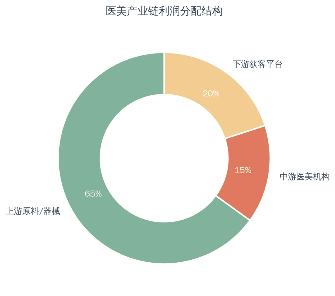 医美产业链利润分层显著,上游凭借研发与牌照壁垒成为盈利核心,占据产业链约 65% 的利润。中游医美机构整体未实现普遍盈利,利润占比约 15%,头部连锁机构成为整合主力。下游获客平台占比约 20%,数字化引流推动了行业效率提升。