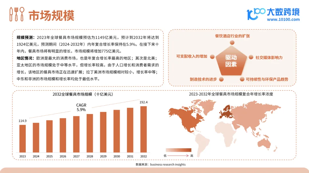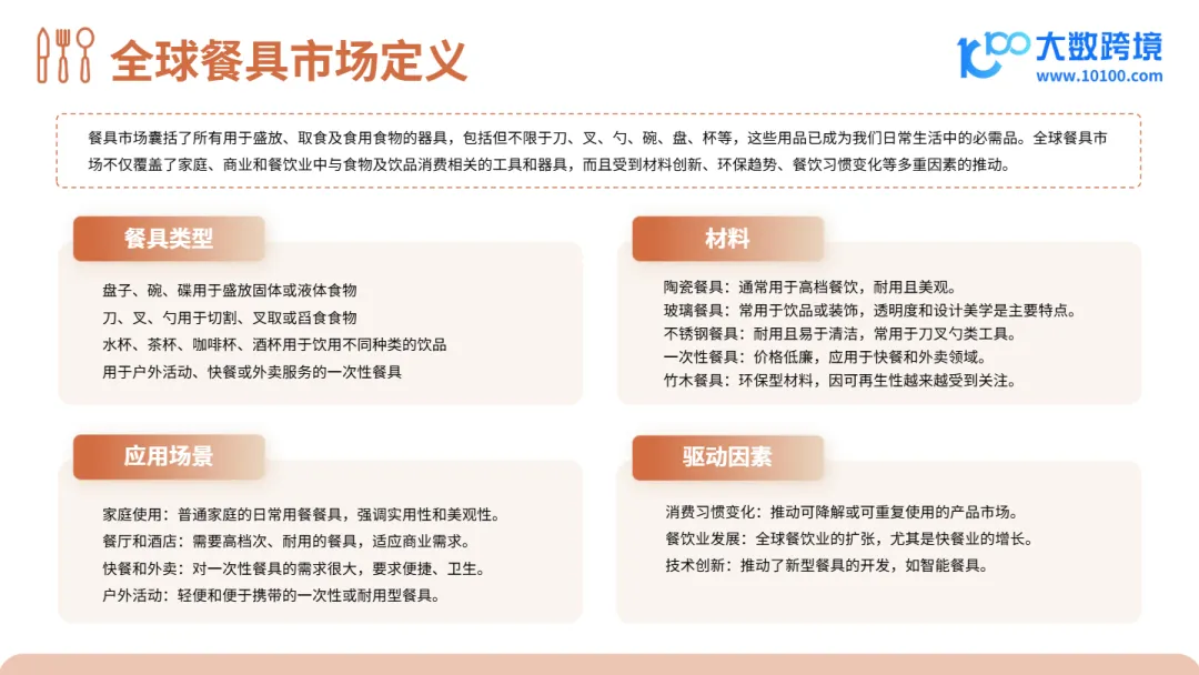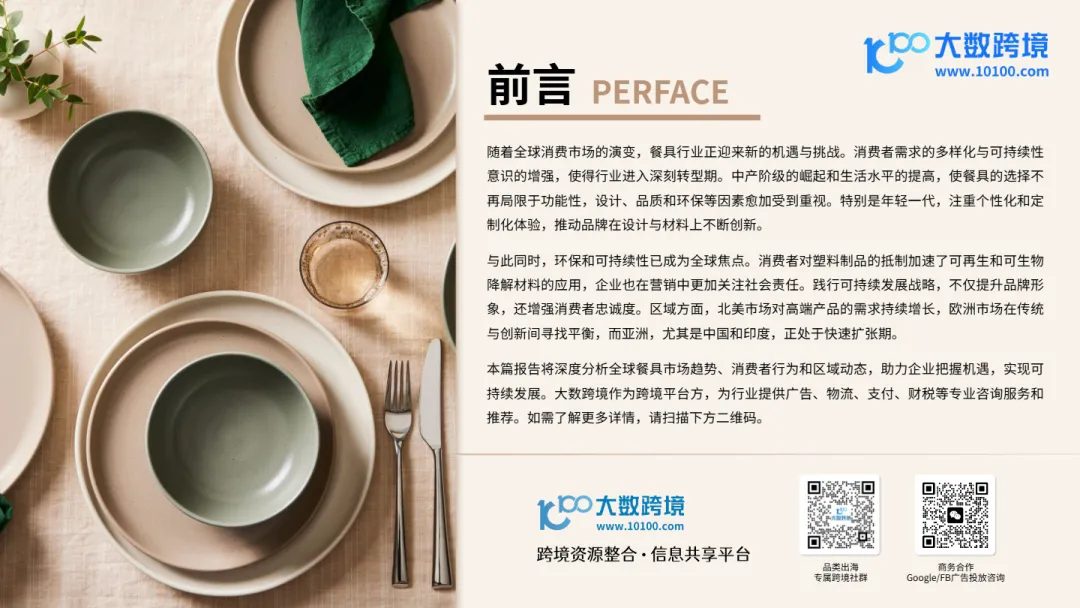 本文件深度剖析了全球餐具品类出海市场趋势,为出海企业提供了从宏观市场规模、消费者行为洞察到可持续发展趋势及成功品牌案例的全景式研究报告。文件指出,随着环保法规趋严、Z世代消费崛起及“一带一路”政策红利释放,餐具品类正从传统制造向DTC品牌化、设计驱动与绿色出海转型,跨境企业必须在产品定位、材料创新与品牌叙事上做出战略升级。