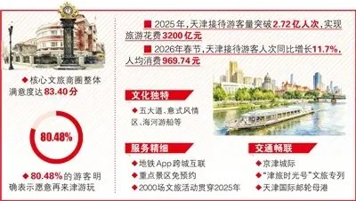 近年来,依托得天独厚的文旅资源、精细化暖心服务、四通八达的交通网络,天津文旅市场持续焕发活力,游客满意度稳步攀升。据天津市消费者协会发布的文旅商圈满意度调查报告显示,核心文旅商圈整体满意度达83.40分,80.48%的游客明确表示愿意再次来津游玩。