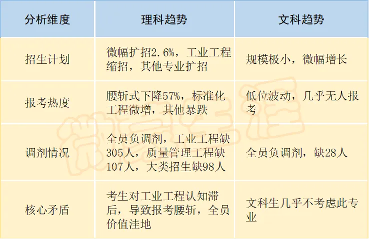 理科数据呈现出一个清晰的“整体遇冷、全员洼地”的图景:工业工程类招生计划微幅增长,但报考人数腰斩,生源缺口持续扩大。所有细分专业均持续负调剂,成为价值洼地,没有竞争红海。