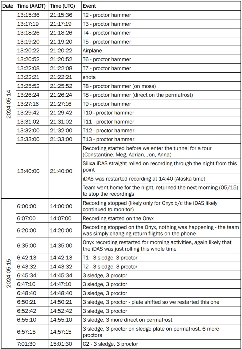 在一项新型实验中,一根光纤电缆被非破坏性地铺设在已知冻土区上,用以通过 DAS(分布式声学传感)监测随活动层(Active Layer)变化的地震响应差异。数据分别在 2024 年 5 月使用两套阵列收集,2024 年 9 月使用一套阵列收集。用于激发 DAS 阵列的地震源包括地表及冻土隧道内的传统主动地震冲击(即 Proctor Hammer 和 Sledgehammer),以及空中主动源(即部署的无人航空系统 UAS、飞越喷气机和飞越直升机)。