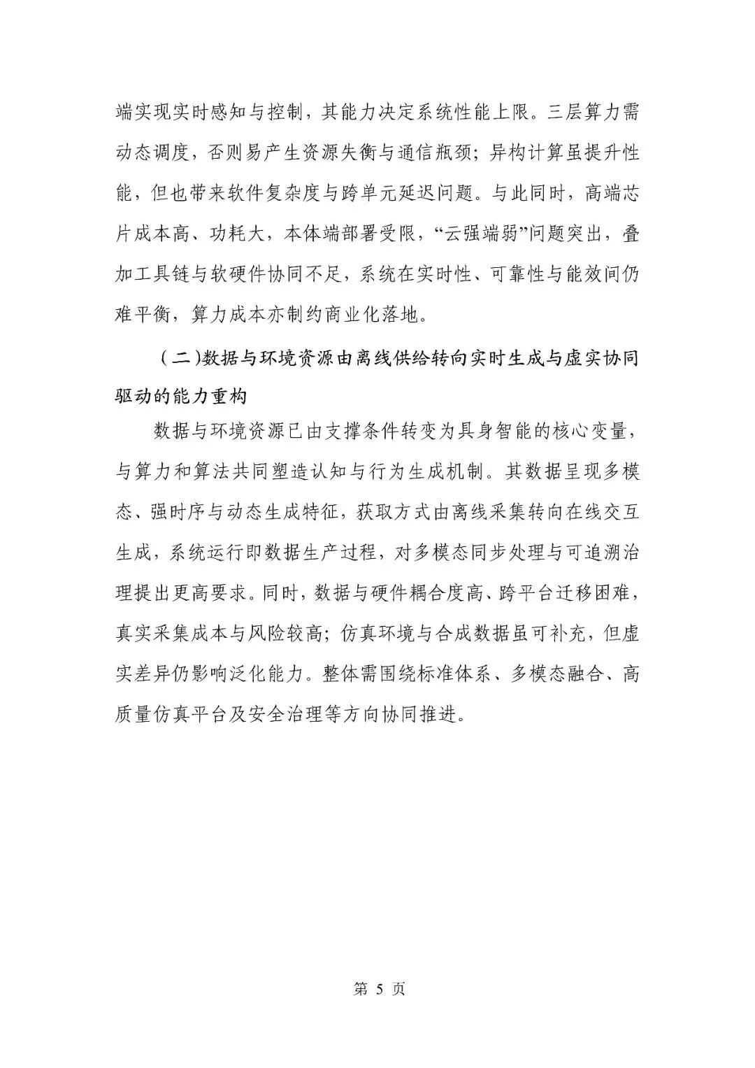 1、具身智能加速拓展现实世界应用,成为人工智能演进的重要方向。具身智能正推动人工智能由以信息处理为主的"离身智能"向面向真实环境的应用形态转变,通过与物理载体融合,实现感知、决策与行动的闭环运行,应用边界持续拓展,发展基础不断夯实,已成为人工智能走向现实世界的重要路径。同时也应看到,具身智能整体仍处于由技术探索迈向规模化应用的过渡阶段,在通用能力、稳定性和实际落地水平等方面仍有不足。