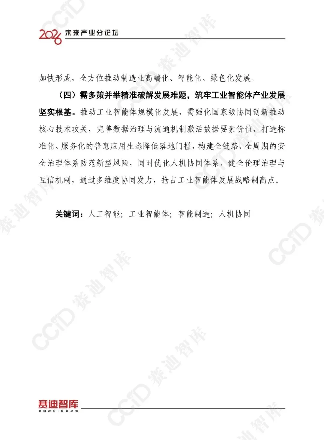 未来,工业智能体将向多智能体系统演进,云边端一体化架构将成为主流,应用将从单点试点向规模化普及演进,普惠化将成为重要方向,产业生态将从分散布局向开放融通演进,安全将从被动防护向内生安全演进,人机关系将从人机替代向人机共生演进。