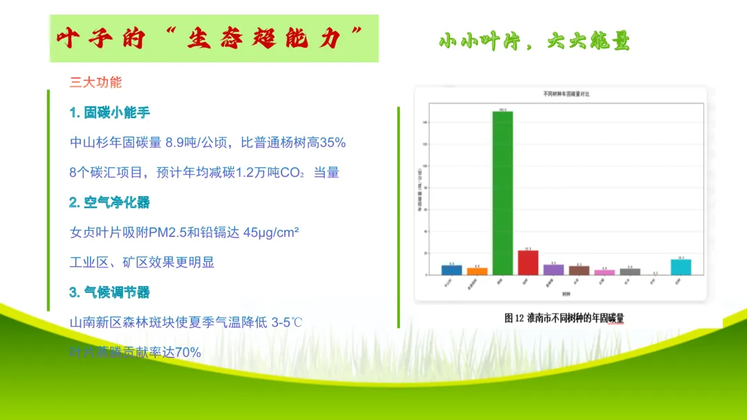 这些发现让我们恍然大悟:原来,叶子小小的身体里,藏着固碳释氧、净化污染、调节气候的“大本领”。而家乡生态的变迁,都写在了每一片叶子的“脸上”。