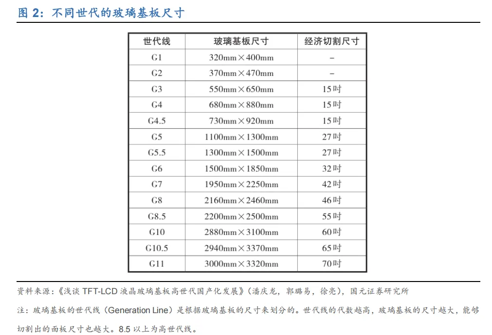 高世代TFT-LCD面板是指G8.5代线及以上的产品,具有大尺寸、高清晰度、高色彩还原度等特点,对应尺寸的玻璃基板为高世代TFT-LCD玻璃基板。高世代玻璃基板的大尺寸使得在单片基板上可以切割出更多数量、更大尺寸的显示面板,极大地提高了生产效率和经济效益。G8.5高世代线可通过套切搭配实现几乎全尺寸段的经济裁切,尤其在85英寸及以上的超大尺寸上具备显著优势。随着套切设备及技术的成熟,G8.6高世代线的产品结构更加丰富,并具有较强的经济效益和灵活性,逐步承接来自G8.5高代线的产品转移。G10.5主要经济切割的产品有32英寸、40英寸(套切)、43英寸、60英寸(套切)、65英寸和75英寸,尤其在65英寸、75英寸单切切割效率高达95%及以上。高世代线的创新突破有效提升了中大尺寸显示面板生产效率,具有较强的经济效益。