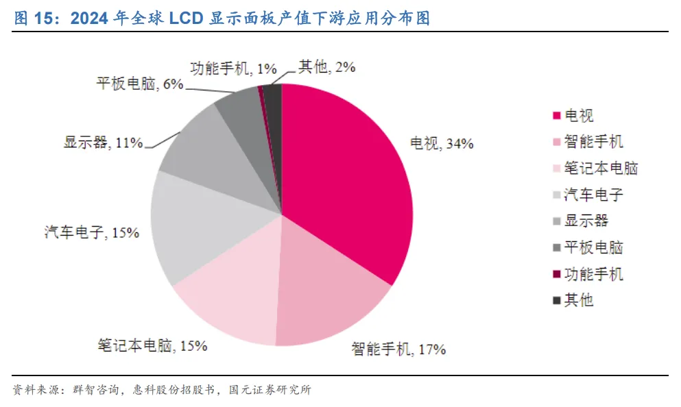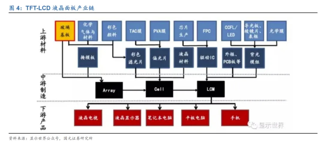 TFT-LCD是目前最主流的显示技术,目前约80%的显示玻璃基板用于LCD面板。玻璃基板是LCD面板产业链的最上游,是整个产业链中技术壁垒最高的环节,约在TFT-LCD上游原材料成本中占比约15.2%。玻璃基板的下游主要是面板厂和彩色滤光片供应商,分别供给他们制作TFT阵列和彩色滤光片,再在成盒段进行灌液晶、组装,制成OpenCell面板。