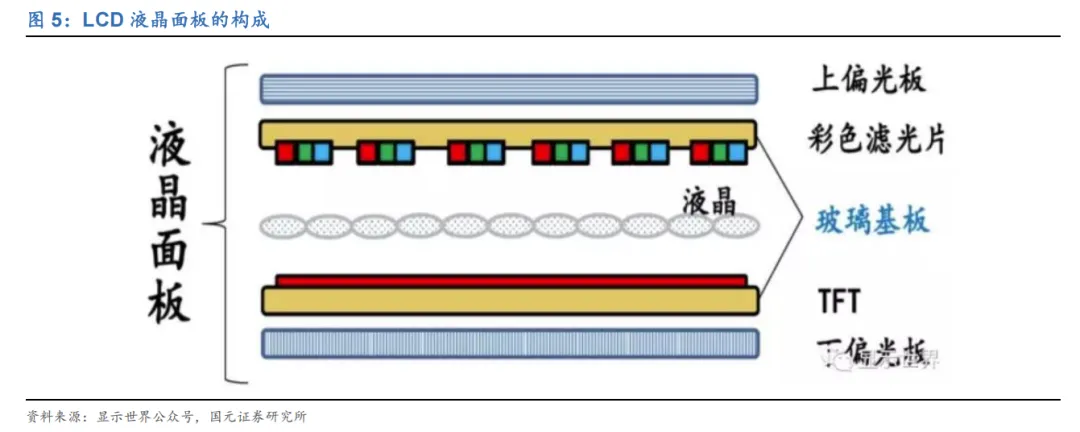 用于LCD显示面板的玻璃基板需满足无碱、高透光、高平整度等标准。如下图所示,一片TFT-LCD液晶面板需使用到二片玻璃基板,即TFT阵列的底层玻璃基板及彩色滤光片的底板,面板成品的分辨率、透光度、厚度、重量、可视角度等指标都与所采用的基板玻璃质量密切相关。