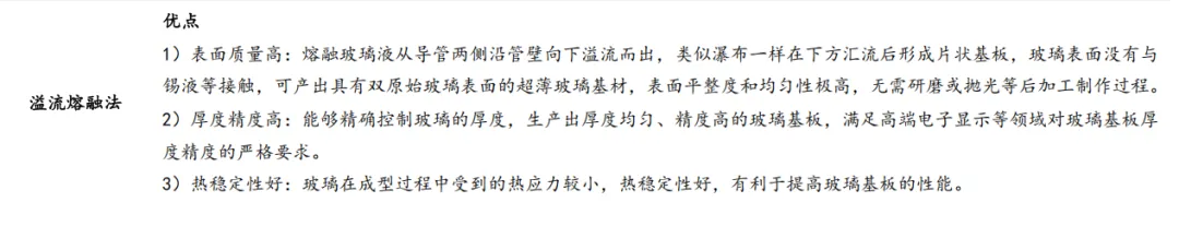 从生产工艺看,溢流下拉法工艺生产的玻璃基板,其表面结构完整性和表面质量远超浮法生产的玻璃基板,是玻璃基板的主流生产工艺技术。玻璃基板生产工艺可以分成浮法、溢流熔融法和流孔下引法。溢流下拉法和浮法,代表厂商分别为美国康宁公司和日本旭硝子株式会社。溢流下拉法工艺生产的玻璃基板,其表面结构完整性和表面质量远超浮法生产的玻璃基板。溢流下拉法是玻璃基板的主流生产工艺技术。