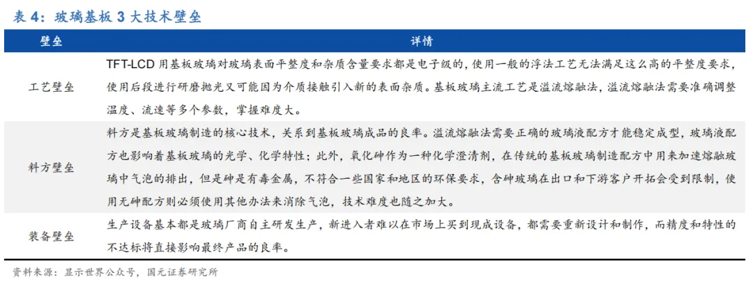 工艺、料方及装备构成基板玻璃行业三大技术壁垒。玻璃基板属于技术密集型和资本密集型行业,存在料方壁垒、装备壁垒、工艺壁垒三大壁垒,工艺复杂,装备昂贵,技术门槛高,资本投入大。