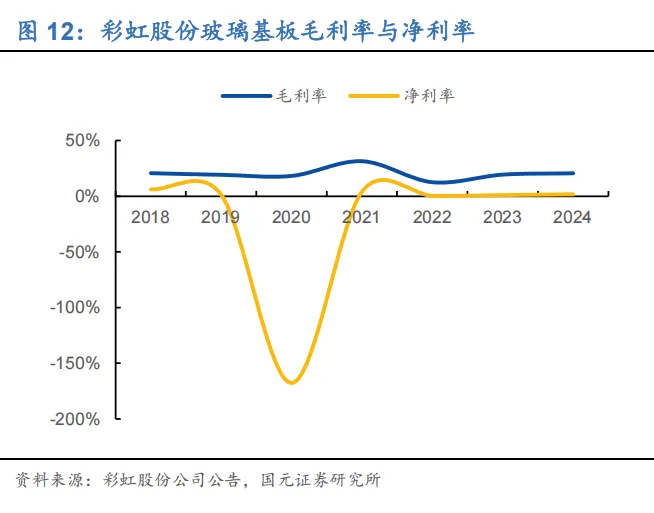 2024年,彩虹股份玻璃基板业务收入15.11亿元,年产量749.72万片,年销量694.13万片,毛利率20.56%,净利率1.59%。玻璃基板的成本由折旧、能源、人工等组成,目前彩虹股份受折旧等因素影响,利润率较低,随着产线陆续铺开+产能利用率提升带来规模效应,公司利润率有望逐步提升。彩虹股份与康宁均采用流溢下拉法生产显示玻璃基板,参考康宁显示业务利润率,彩虹股份达成规模效应后,利润率有望改善。