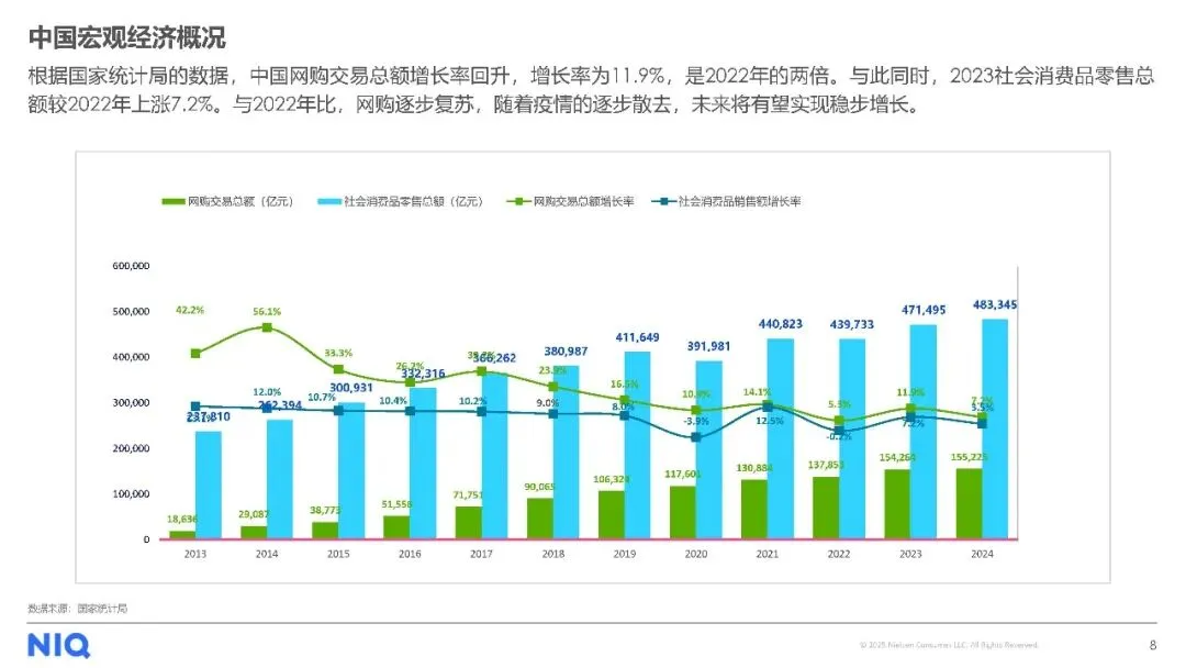 国家统计局数据显示,2025 年全年网购交易总额增长率回升至 11.9%,这个数字是 2022 年的两倍,跑赢社会消费品零售总额 3.5% 的增速。线上渠道的渗透还在加速,截至 2025 年 6 月的滚动年数据里,线上销售额占比已经达到 40.4%,比一年前提升了 4.5 个百分点。
