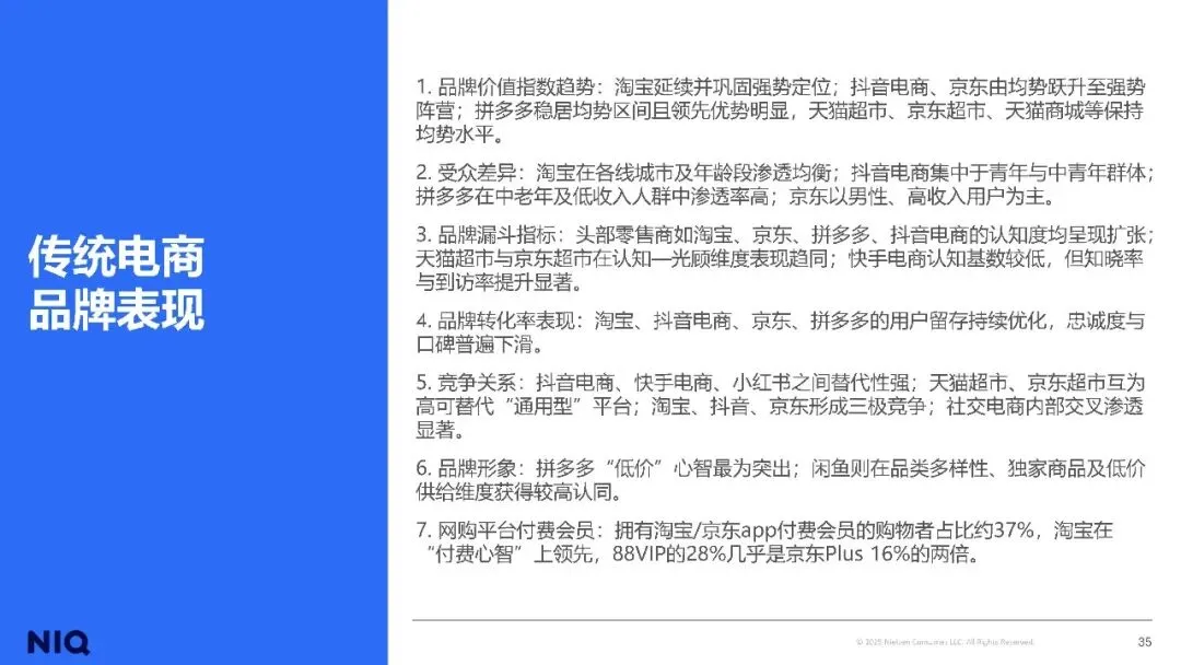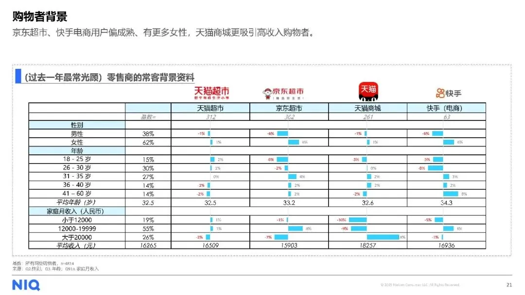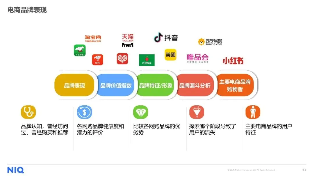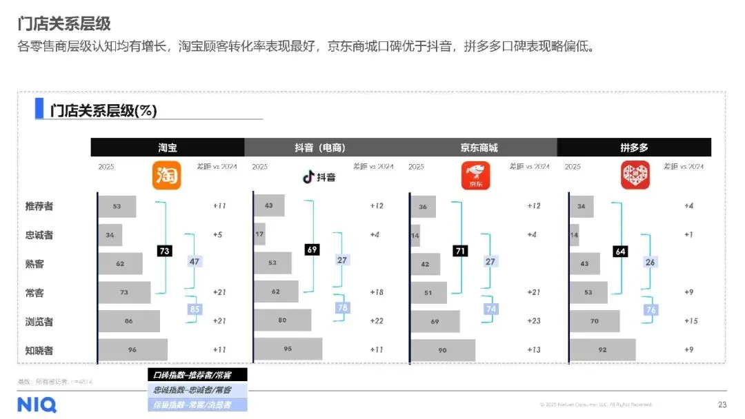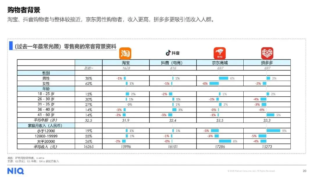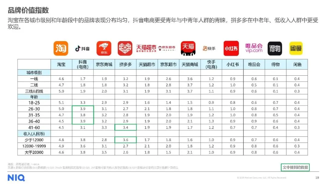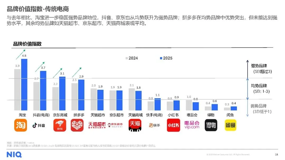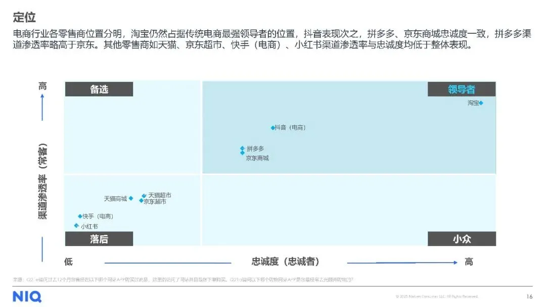 电商行业的座次正在发生微妙但关键的变化。淘宝依然稳坐传统电商头把交椅,在各线城市和年龄段的渗透都保持均衡。抖音电商和京东商城从去年的均势品牌跃升为强势品牌。拼多多虽然还在均势区间,但优势已经非常突出,在中老年和低收入群体中渗透率领先。不同平台的用户画像差异越来越清晰。