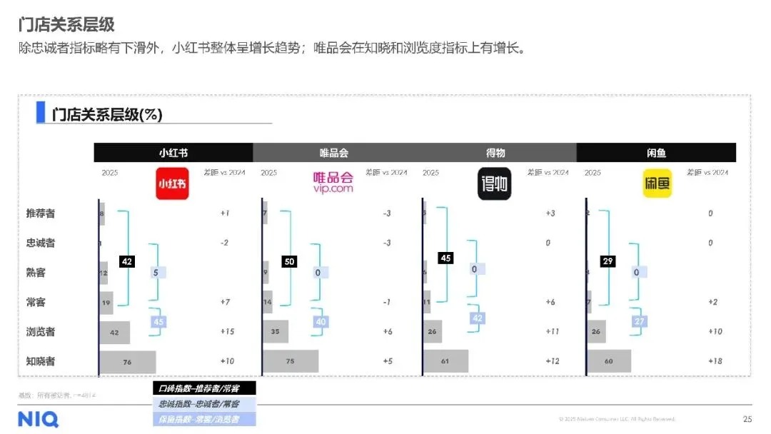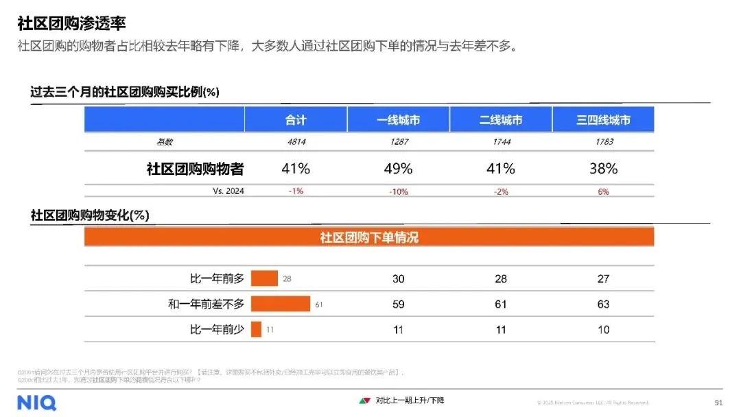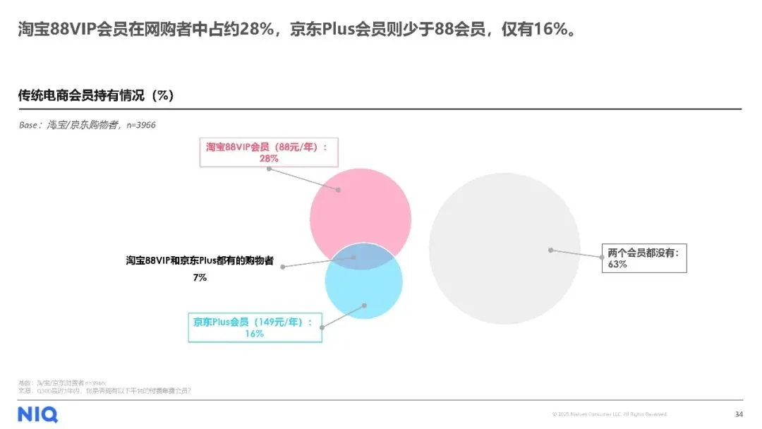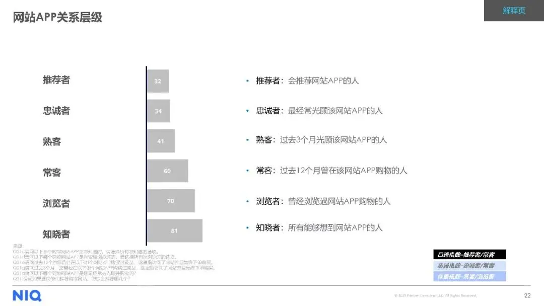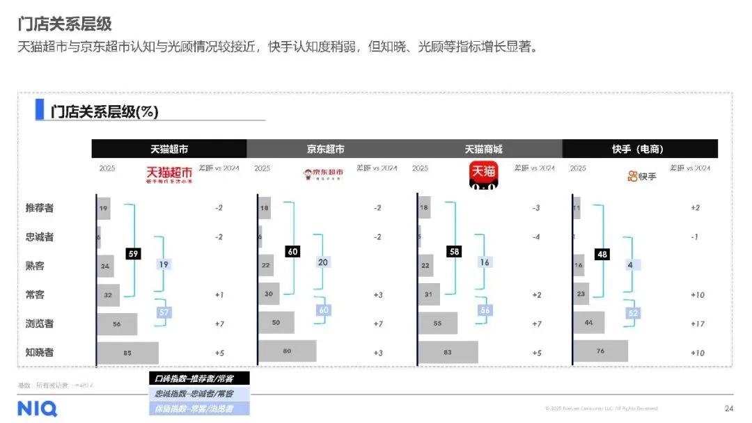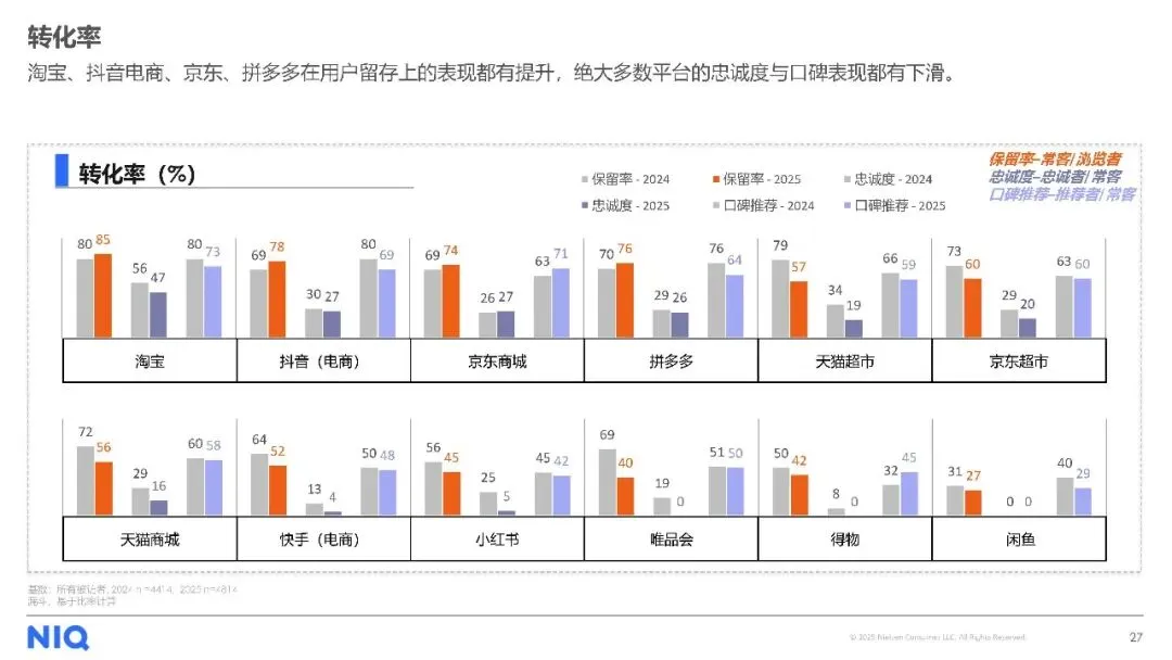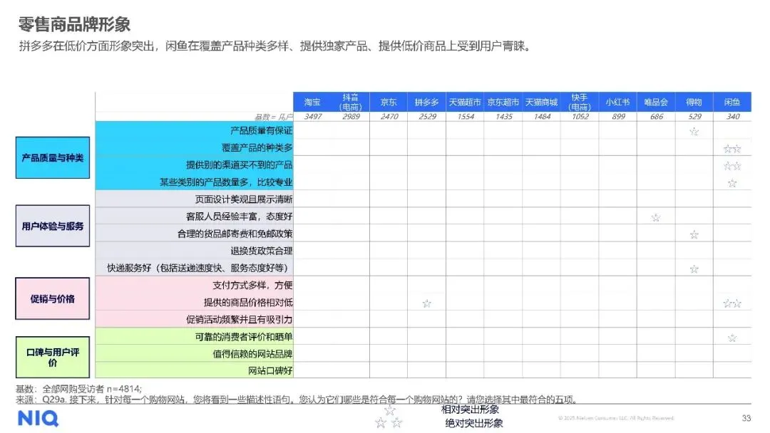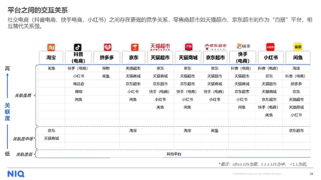 电商行业的座次正在发生微妙但关键的变化。淘宝依然稳坐传统电商头把交椅,在各线城市和年龄段的渗透都保持均衡。抖音电商和京东商城从去年的均势品牌跃升为强势品牌。拼多多虽然还在均势区间,但优势已经非常突出,在中老年和低收入群体中渗透率领先。不同平台的用户画像差异越来越清晰。