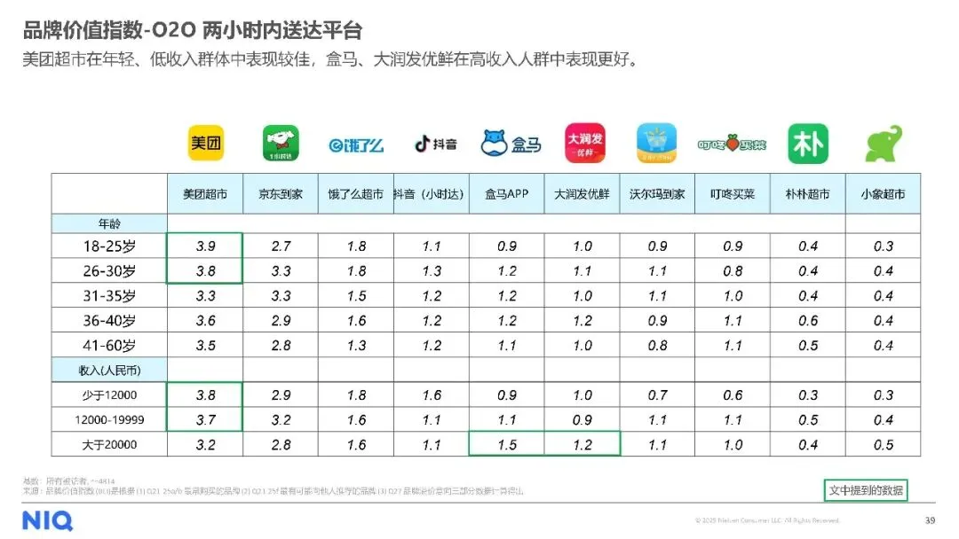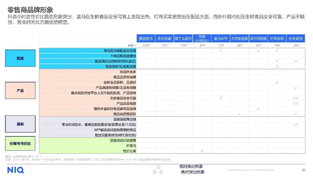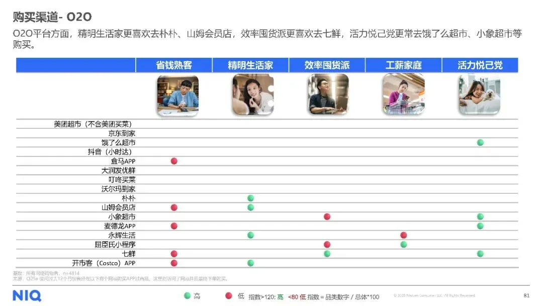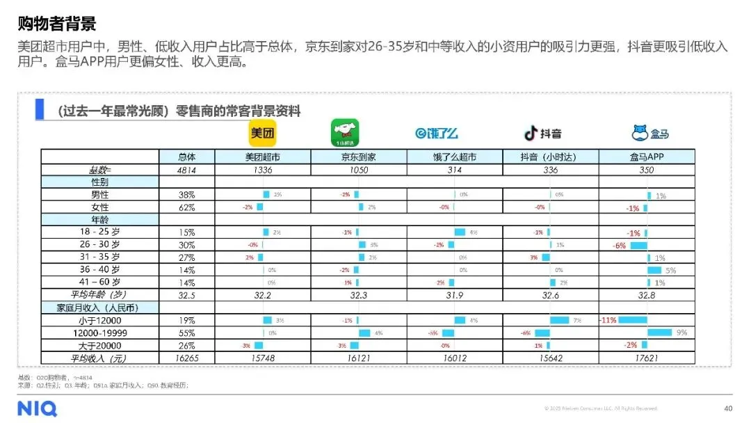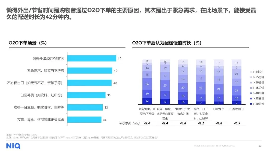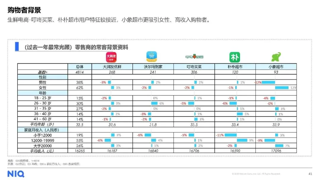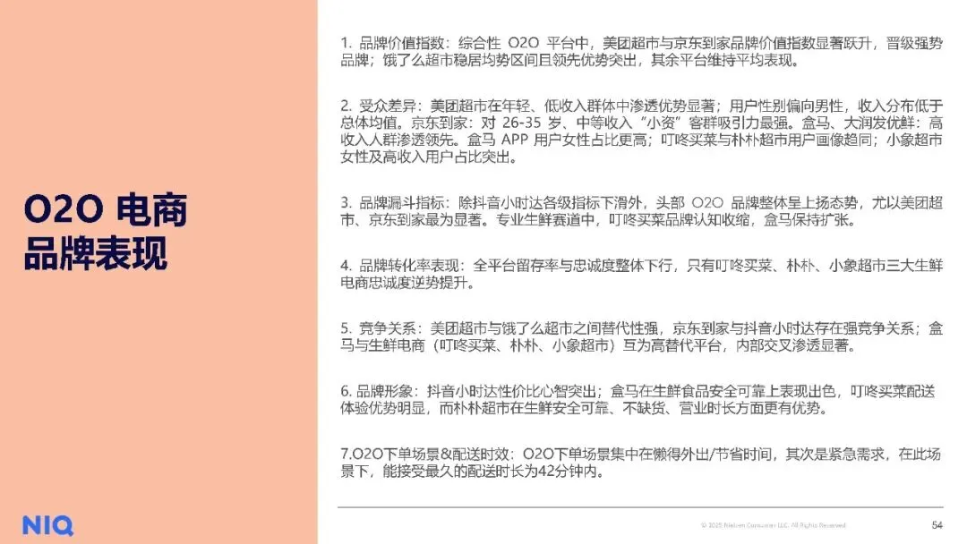 O2O 赛道的竞争同样激烈。美团超市和京东到家已经成为行业领导者。44% 的消费者使用 O2O 平台是因为懒得外出想节省时间,40% 是出于紧急需求,他们能接受的最长配送时长是 42 分钟。盒马在高收入人群中表现最好,女性占比更高。朴朴超市和叮咚买菜的用户画像高度相似,而小象超市更吸引女性和高收入群体。
