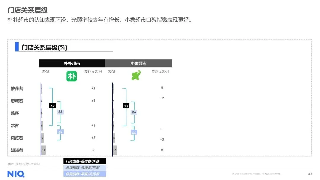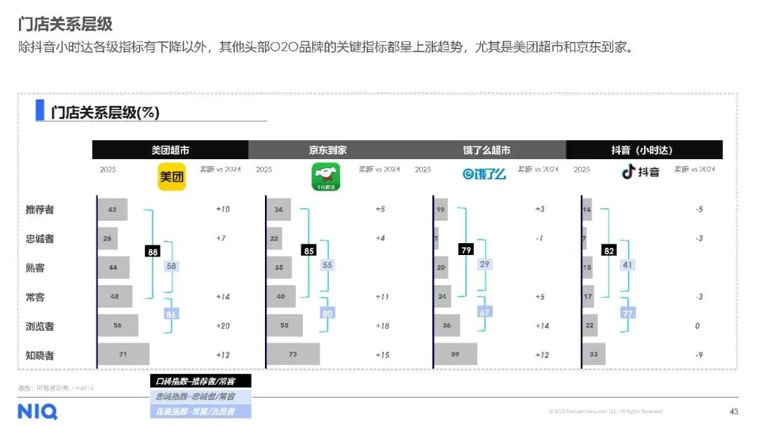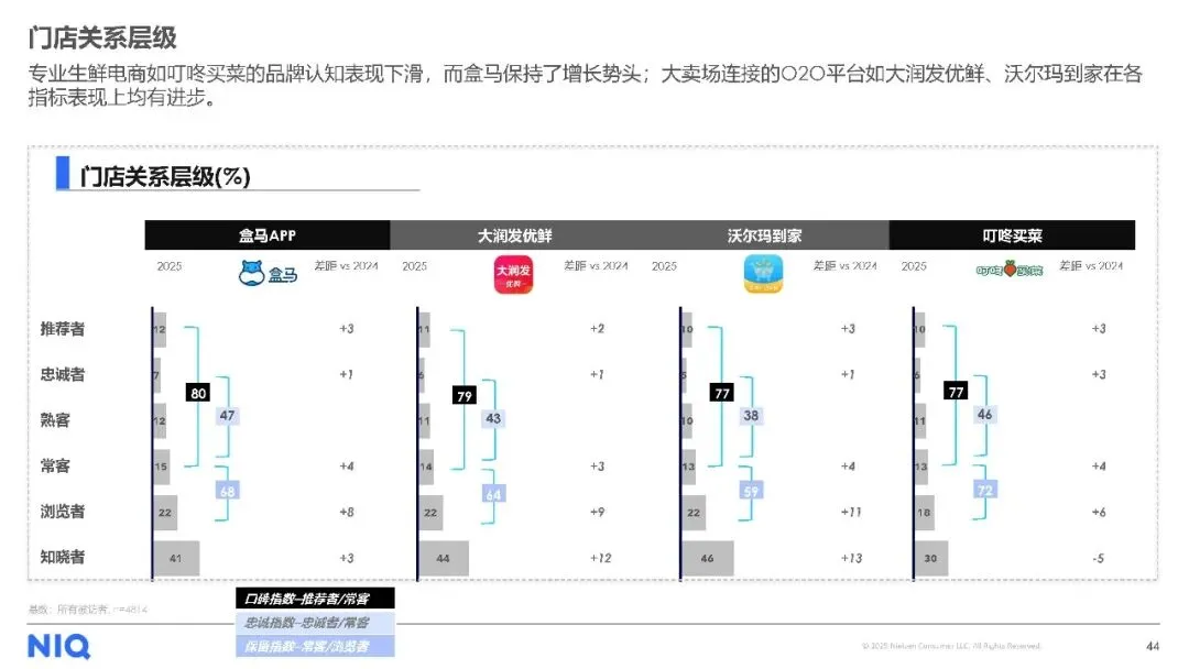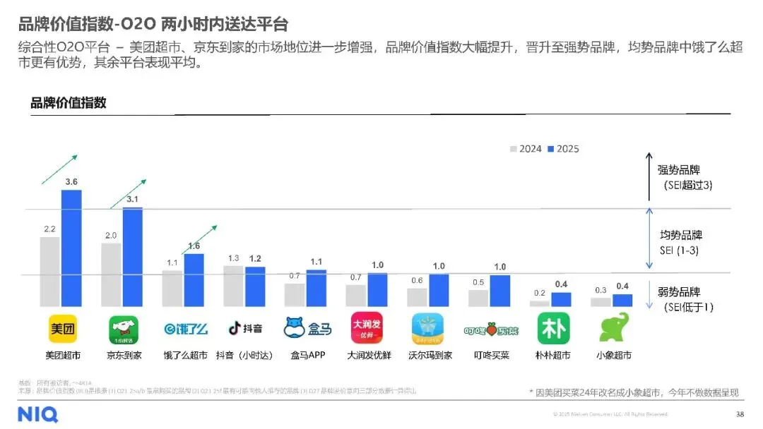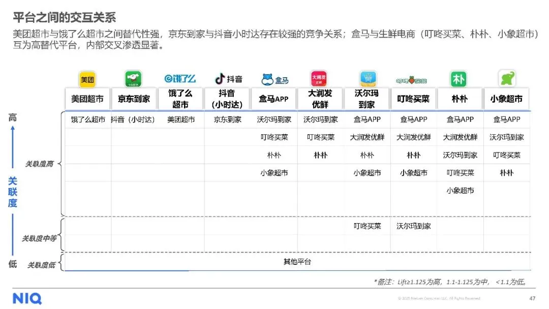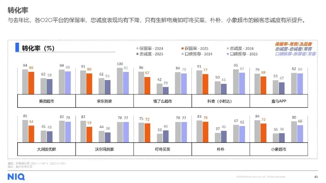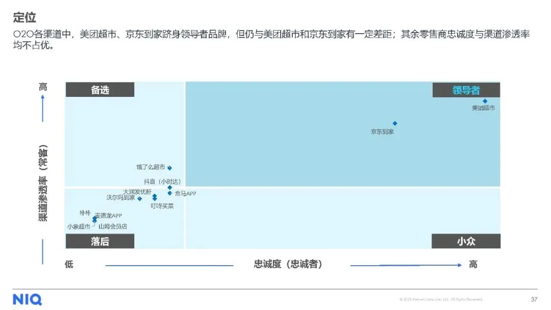 O2O 赛道的竞争同样激烈。美团超市和京东到家已经成为行业领导者。44% 的消费者使用 O2O 平台是因为懒得外出想节省时间,40% 是出于紧急需求,他们能接受的最长配送时长是 42 分钟。盒马在高收入人群中表现最好,女性占比更高。朴朴超市和叮咚买菜的用户画像高度相似,而小象超市更吸引女性和高收入群体。