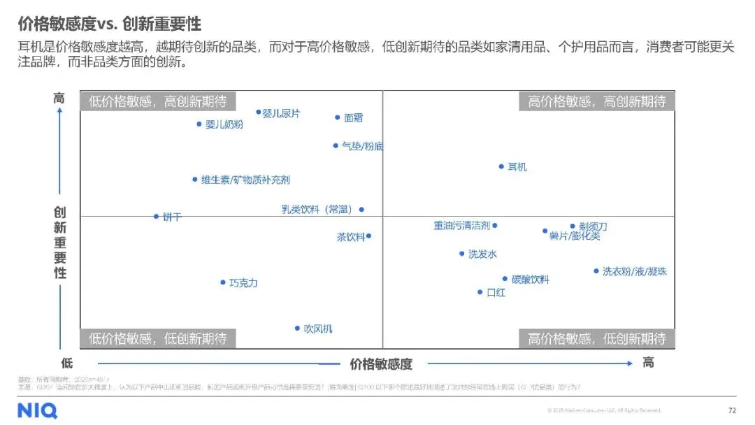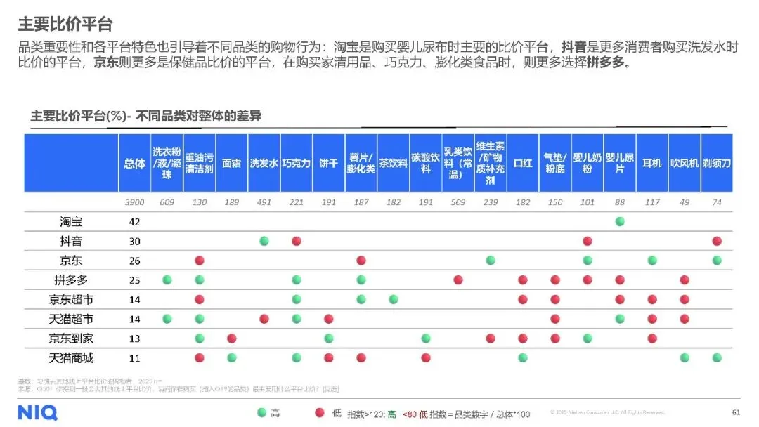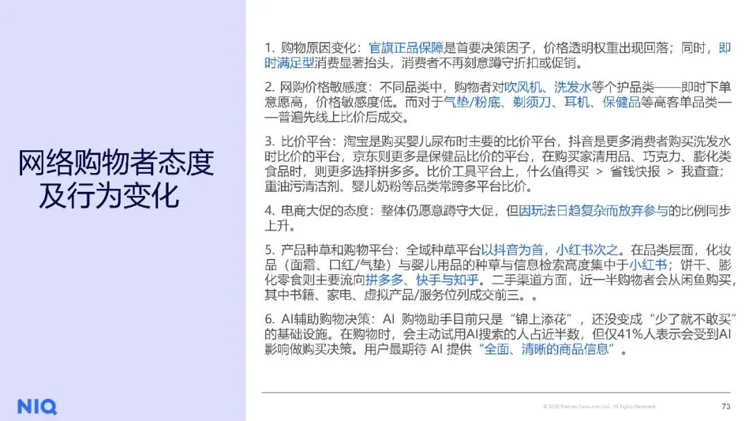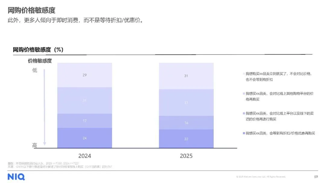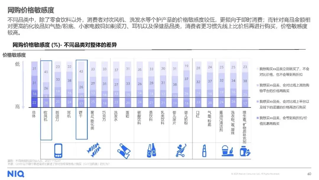 消费者的购物心态正在发生根本性转变。越来越多人倾向于即时消费,不再刻意等待折扣。31% 的消费者表示想买就买,不会对比价格也不会等优惠,这个比例比去年上升了 2 个百分点。只有 22% 的人会等到有折扣再购买,比去年下降了 2 个百分点。不同品类的价格敏感度差异巨大,吹风机和洗发水等个护产品价格敏感度最低,消费者更愿意即时下单。而气垫粉底剃须刀耳机和保健品等高客单品类,超过三分之一的消费者会先在多个线上平台比价后再购买。