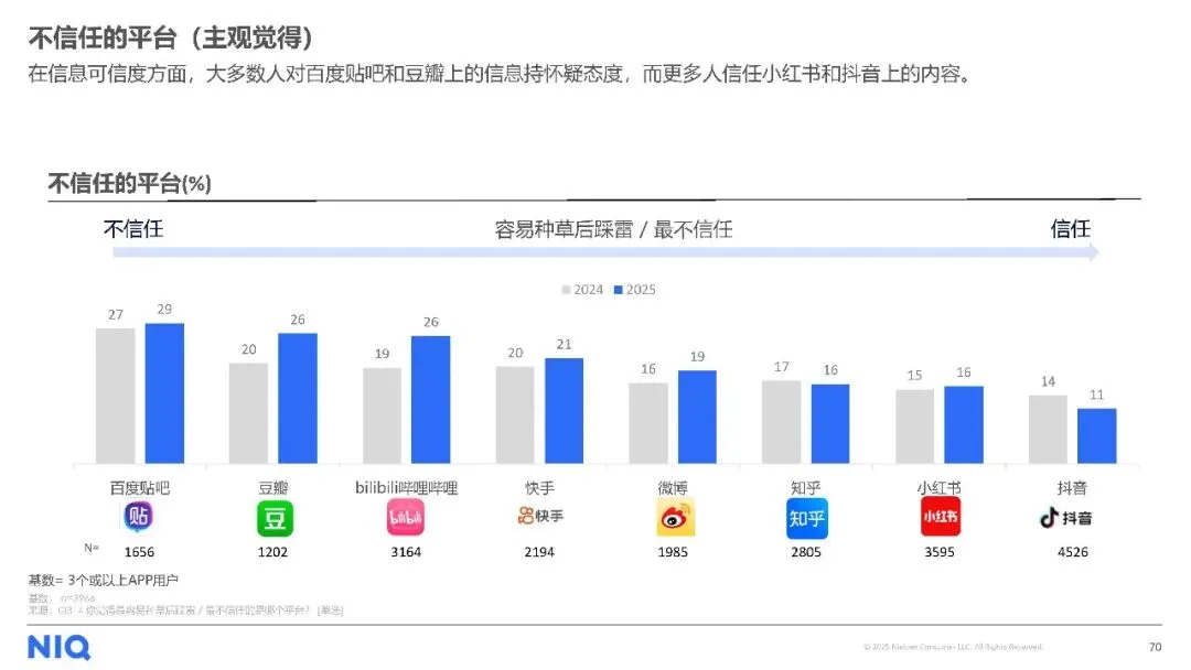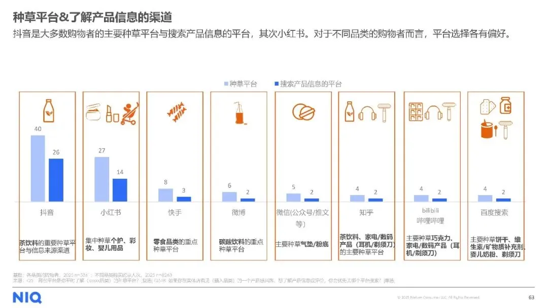 比价平台的选择也带有明显的品类特征。买婴儿尿布大家最先想到淘宝,买洗发水更多去抖音比价,买保健品首选京东,而家清用品巧克力和膨化食品,拼多多是最主要的比价平台。种草渠道方面,抖音已经成为大多数购物者的首选,然后是小红书。化妆品和婴儿用品的种草高度集中在小红书。