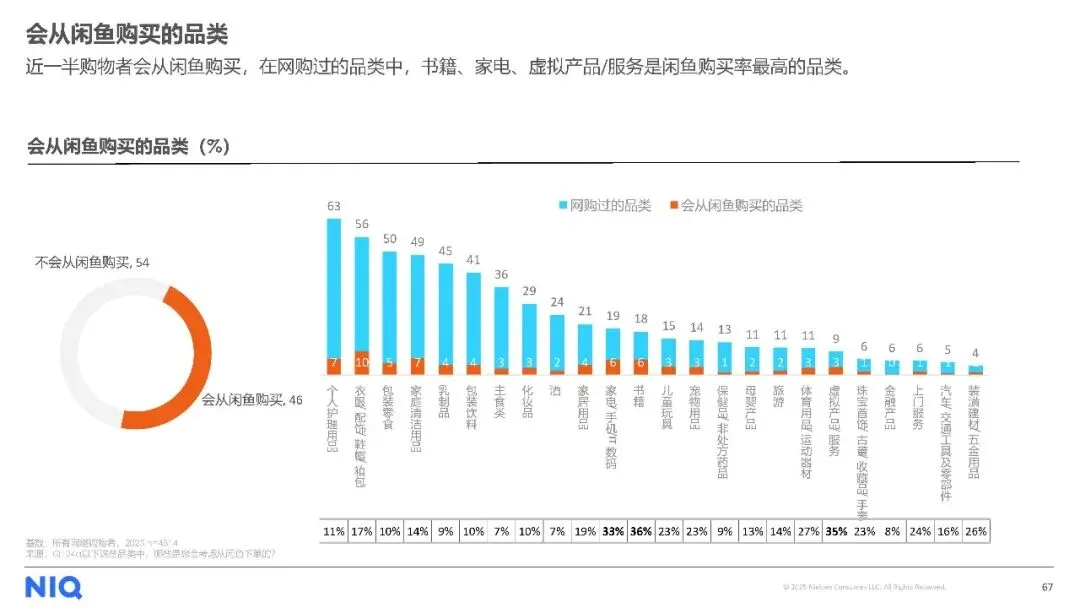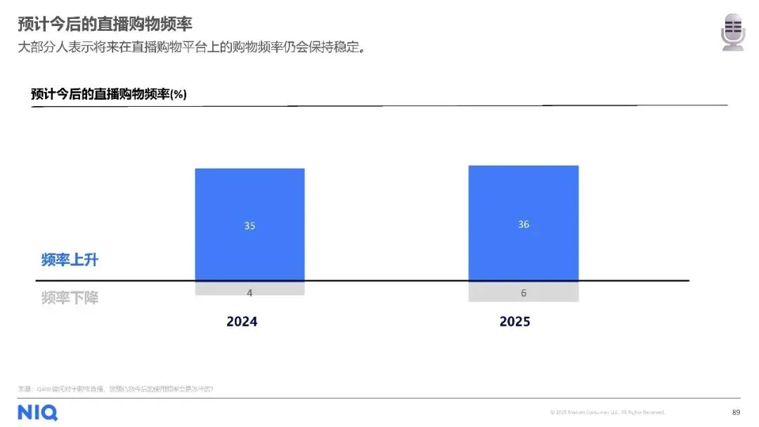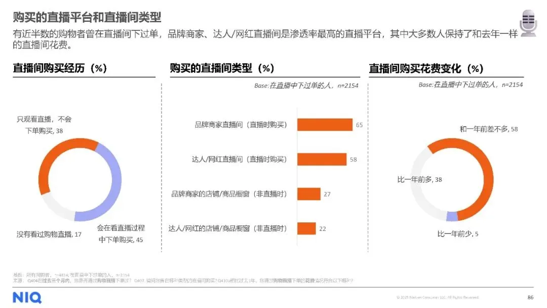 二手交易的接受度正在提升。46% 的网购者会考虑从闲鱼购买商品,其中书籍家电和虚拟产品服务是购买率最高的三个品类。直播电商的渗透率保持稳定,45% 的消费者曾在直播间下单,品牌商家直播间的渗透率达到 65%,高于达人网红直播间的 58%。和去年相比,58% 的人直播间花费没有变化,38% 的人花费有所增加。