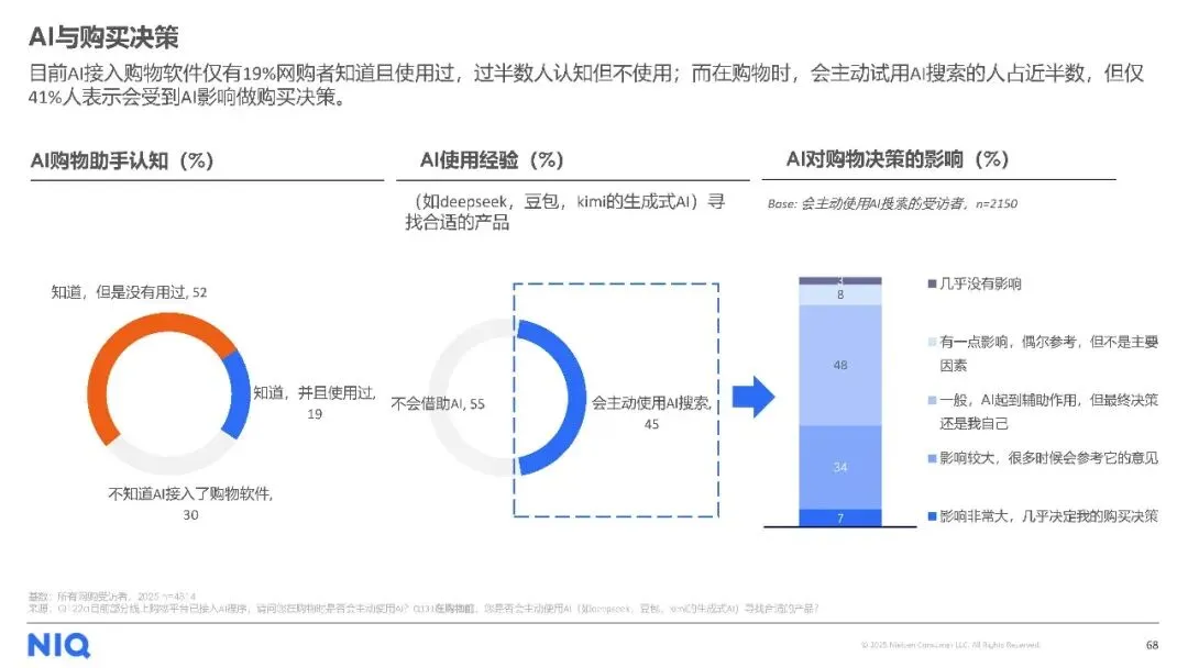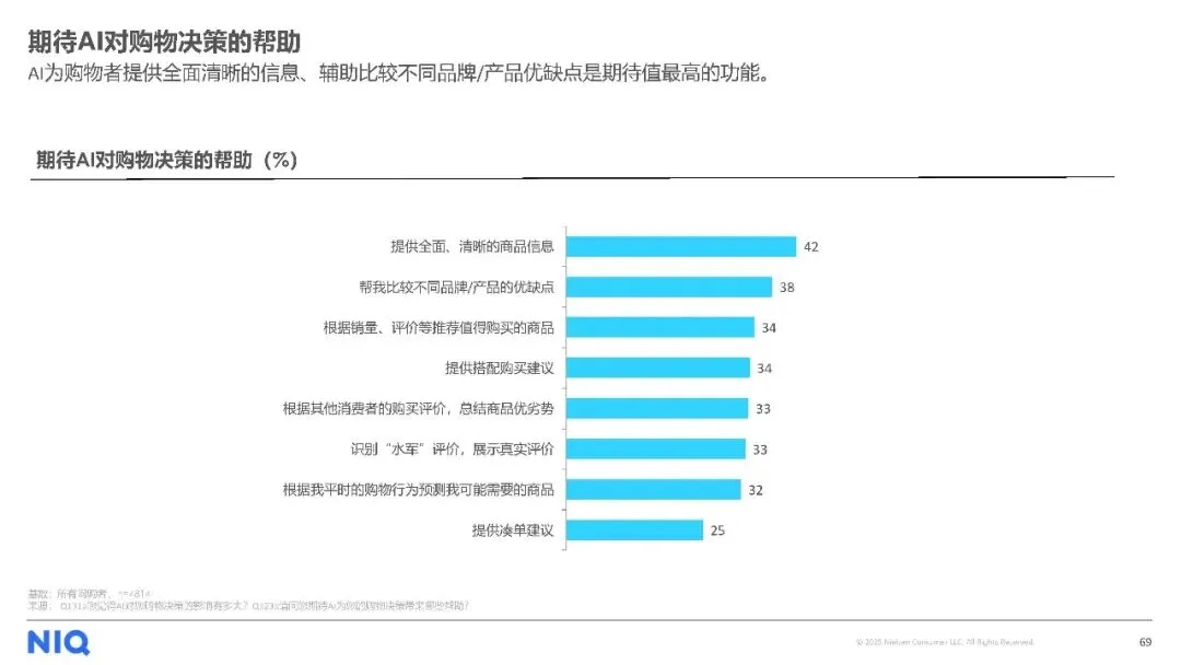 AI 购物助手目前还处于锦上添花的阶段。只有 19% 的网购者知道并且使用过接入购物软件的 AI 功能,52% 的人知道但没有用过。45% 的人会在购物时主动使用 AI 搜索,但只有 41% 表示会受到 AI 的影响做出购买决策。消费者最期待 AI 提供全面清晰的商品信息,其次是帮助比较不同品牌和产品的优缺点。