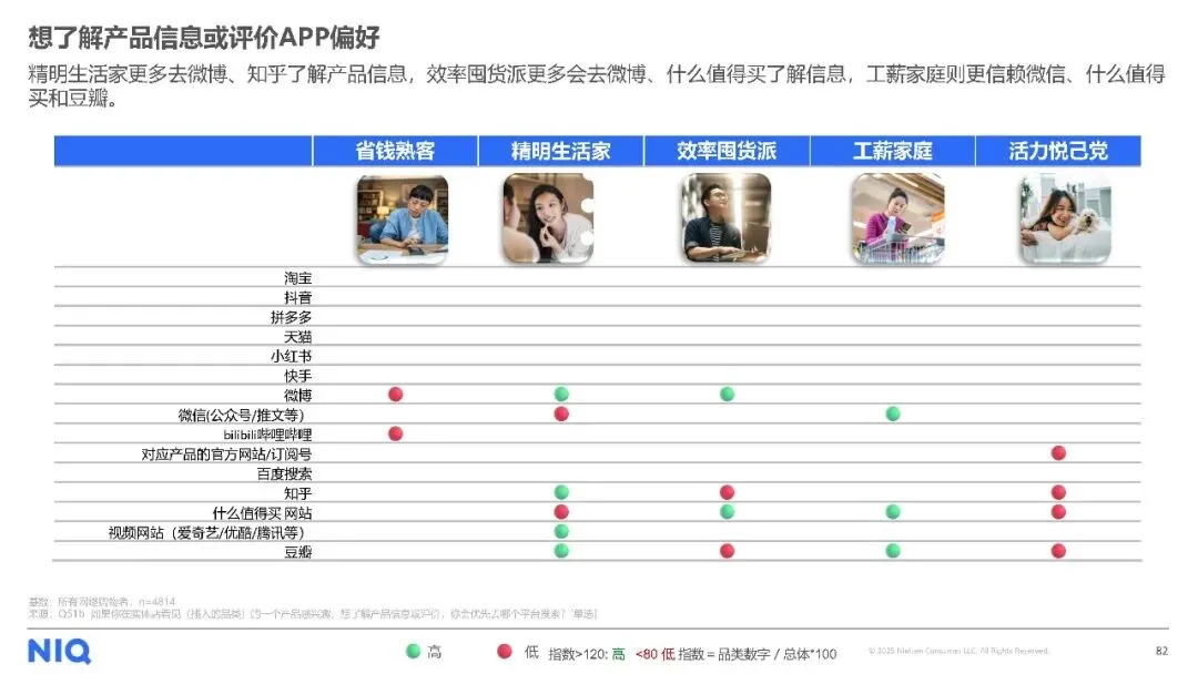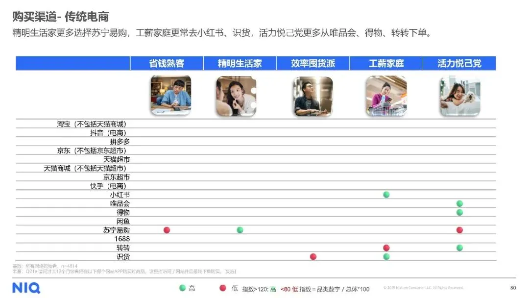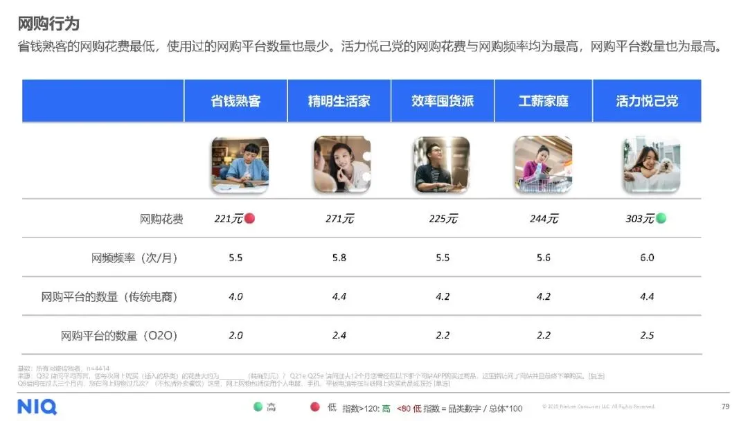 网购人群可以清晰地划分为五类。省钱熟客占比最高达到 34%,他们收入偏低,网购花费最低,使用的平台数量也最少。活力悦己党虽然只占 15%,但网购花费和频率都是最高的,平均每次花费 303 元,每月网购 6 次,使用的平台数量也最多。精明生活家收入最高,更愿意为好设计支付溢价,同时也热衷于研究大促攻略。效率囤货派男性占比更高,习惯一站式补货,工薪家庭则只在大促节点集中出手,把每一分钱都花在刚需上。