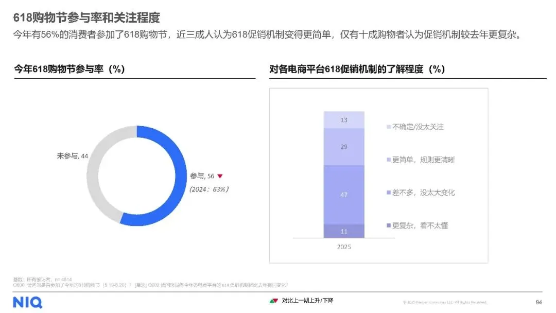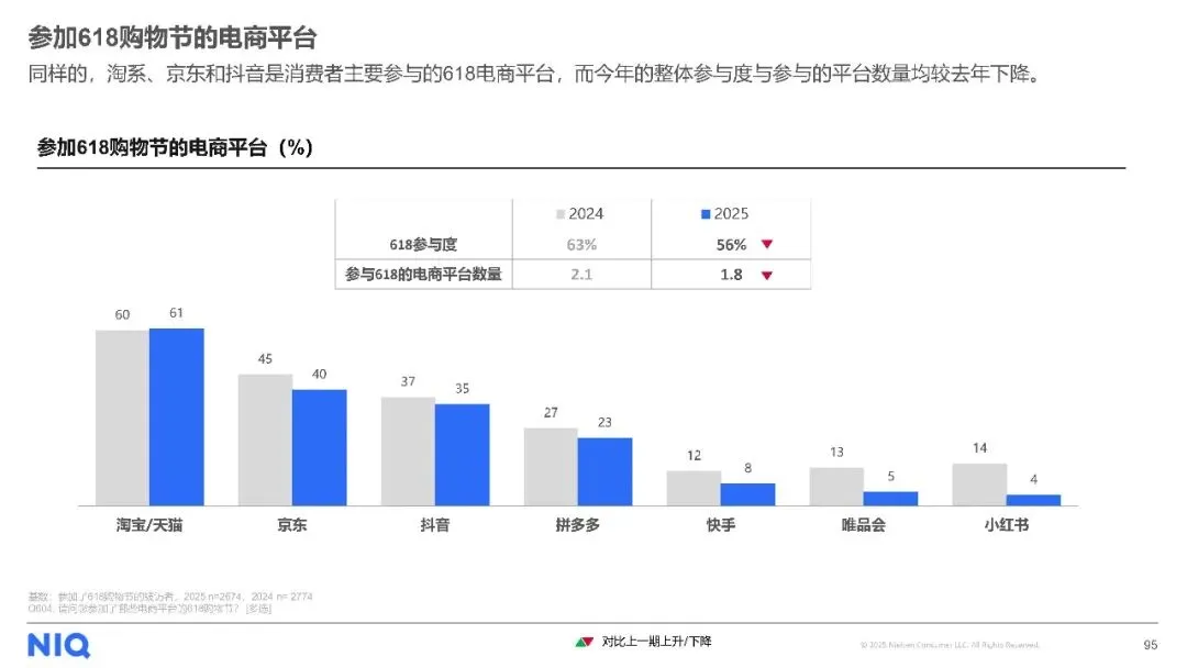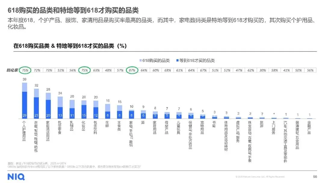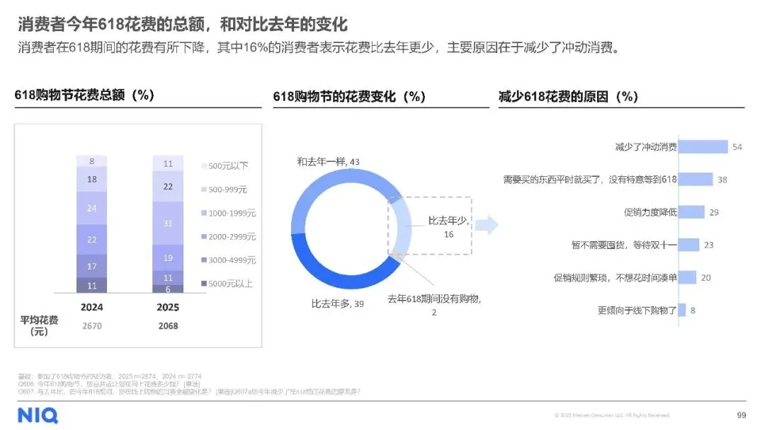购物节的热度正在降温。只有 56% 的消费者参与了 618,比去年的 63% 有所下降。平均花费也从去年的 2670 元降到了 2068 元。54% 减少花费的消费者表示主要原因是减少了冲动消费,38% 的人表示需要买的东西平时就买了,没有特意等到 618。个护产品服饰和家清用品是 618 购买率最高的品类,而家电数码类产品是消费者最愿意特地等到 618 才购买的。