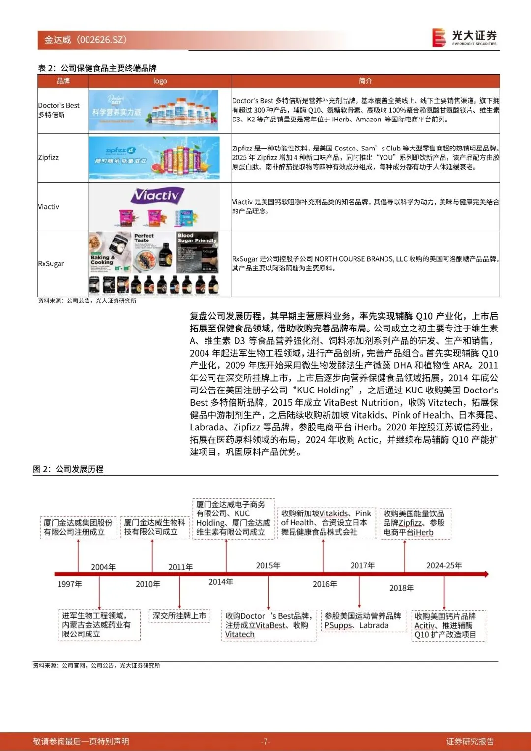 金达威:全产业链布局的保健食品龙头公司。金达威早期主营原料业务,上市后开始拓展C端保健食品领域,借助收购完善品牌布局,目前可已覆盖保健食品上游原料供应、中游制剂生产、下游品牌运营及渠道布局等多个环节。24年公司总营收32.4亿元,其中营养原料/营养保健食品收入分别占比37%/61%。原料产品以辅酶Q10和维生素A为主,保健食品以Doctor'sBest多特倍斯、Zipfizz等品牌为主,目前主要在境外生产销售,同时通过跨境电商在国内亦有一定体量。