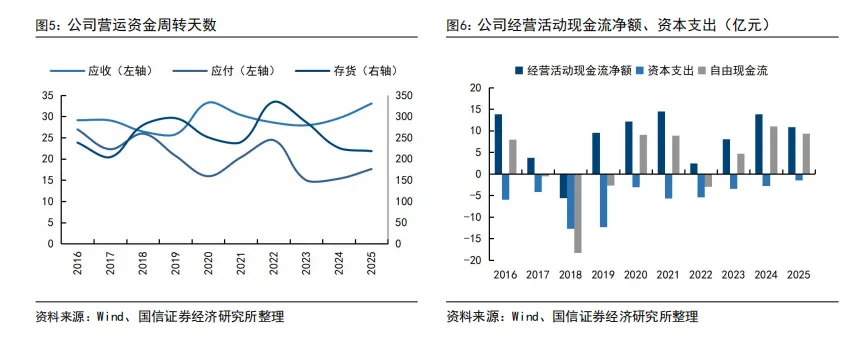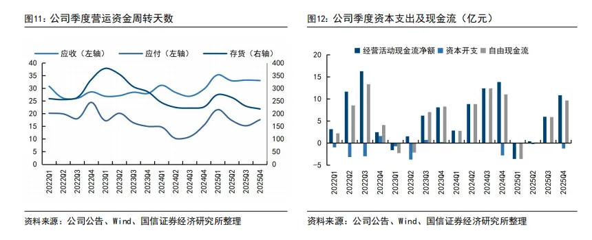 色纺纱毛利率显著提升,坯纱占比提升,越南基地盈利持续增长。1)色纺纱:收入39.56亿元(-2.47%),营收占比下滑至53%;毛利率大幅提升6.62个百分点至17.84%,主要受益于单吨成本下降。2)坯纱:收入34.73亿元(+6.19%),毛利率提升1.52百分点至8.12%。3)产能:越南基地贡献收入62.11亿元(+3.6%),净利润6.42亿元(+27.4%),净利率达10.3%,同比提升1.9pct,产能利用率持续改善。截至2025年底,越南产能约占总产能的78%,达130万锭。