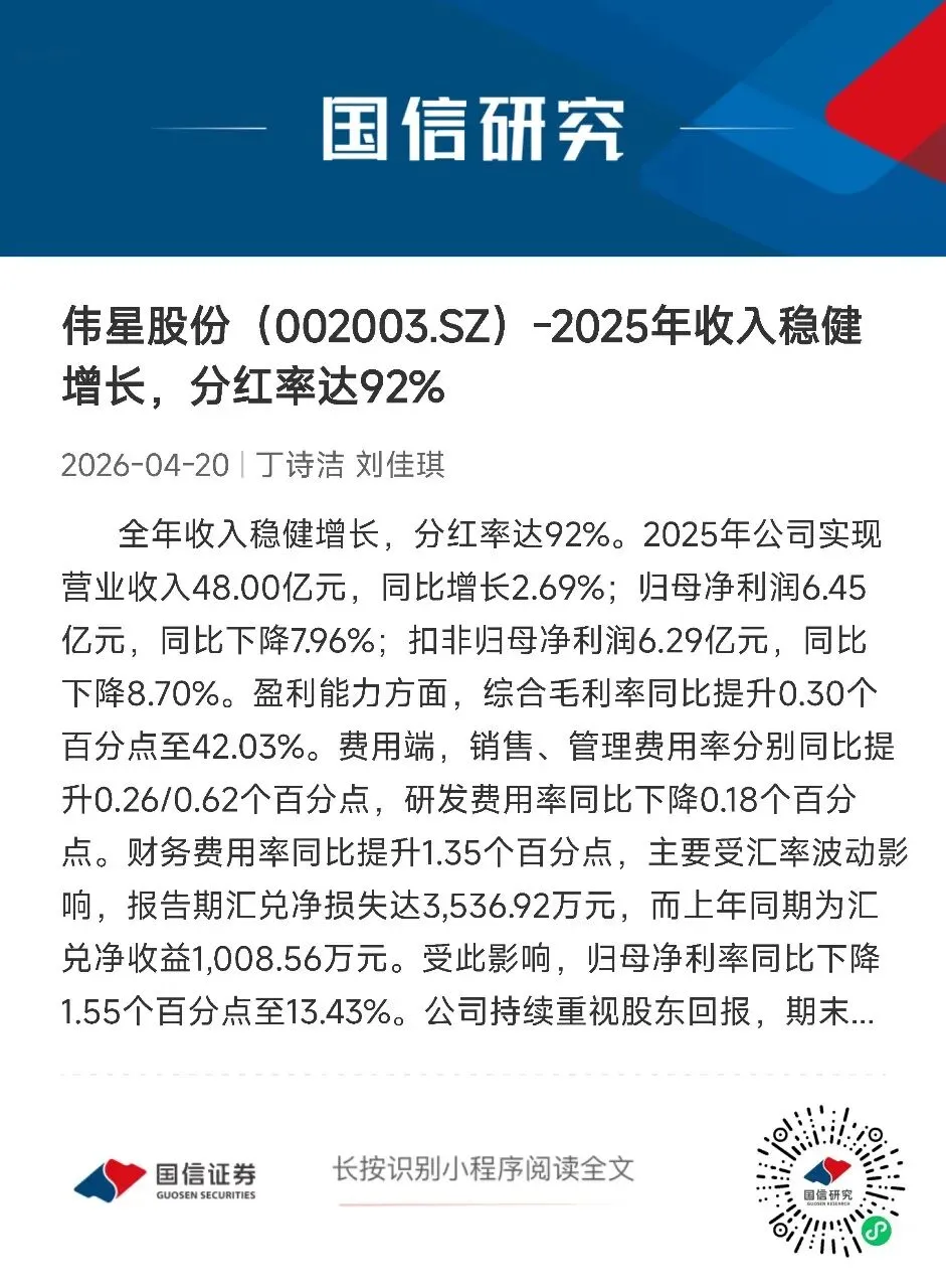 报告名称:《国信证券-财报点评:伟星股份(002003.SZ)-2025年收入稳健增长,分红率达92%》