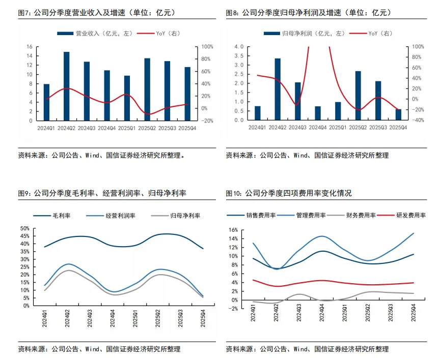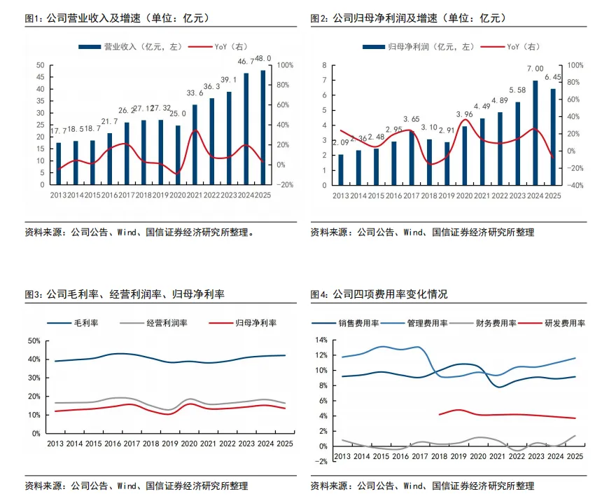 全年收入稳健增长,分红率达92%。2025年公司实现营业收入48.00亿元,同比增长2.69%;归母净利润6.45亿元,同比下降7.96%;扣非归母净利润6.29亿元,同比下降8.70%。盈利能力方面,综合毛利率同比提升0.30个百分点至42.03%。费用端,销售、管理费用率分别同比提升0.26/0.62个百分点,研发费用率同比下降0.18个百分点。财务费用率同比提升1.35个百分点,主要受汇率波动影响,报告期汇兑净损失达3,536.92万元,而上年同期为汇兑净收益1,008.56万元。受此影响,归母净利率同比下降1.55个百分点至13.43%。公司持续重视股东回报,期末拟每10股派息4.00元(含税),叠加已实施的中期分红,2025年度累计现金分红总额预计为5.92亿元,分红率达91.91%。